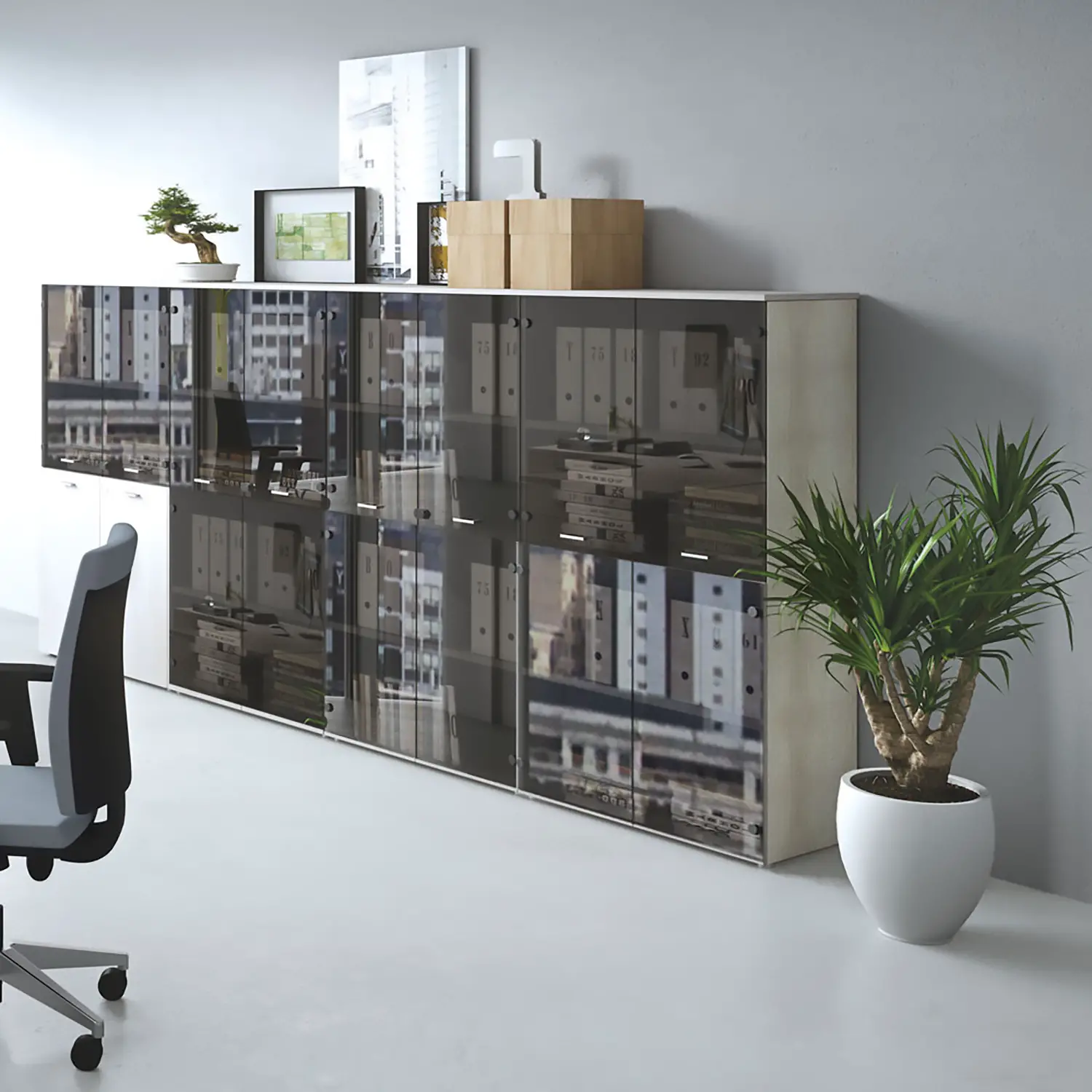 La Libreria “Kamos” - Conforme CAM con ante in vetro è un complemento d’arredo elegante e funzionale, perfetto per uffici e spazi professionali.