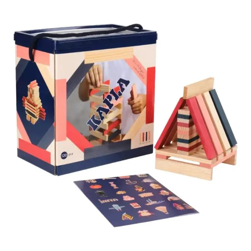 Kapla é un insieme di tavolette unimodulari di legno naturale di pino marittimo coltivato, finemente squadrate, ideali per costruire di tutto senza fissaggio poichè non richiedono colla, viti o chiodi.