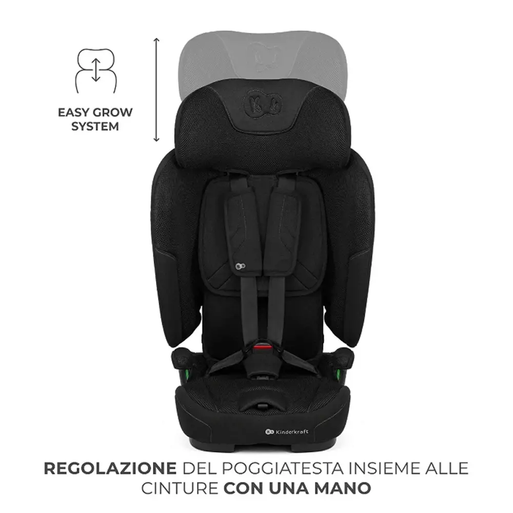 EASY GROW SYSTEM: grows with the child Simultaneous adjustment of headrest and belt makes the seat always fit perfectly, adapting to the child's growth effortlessly.