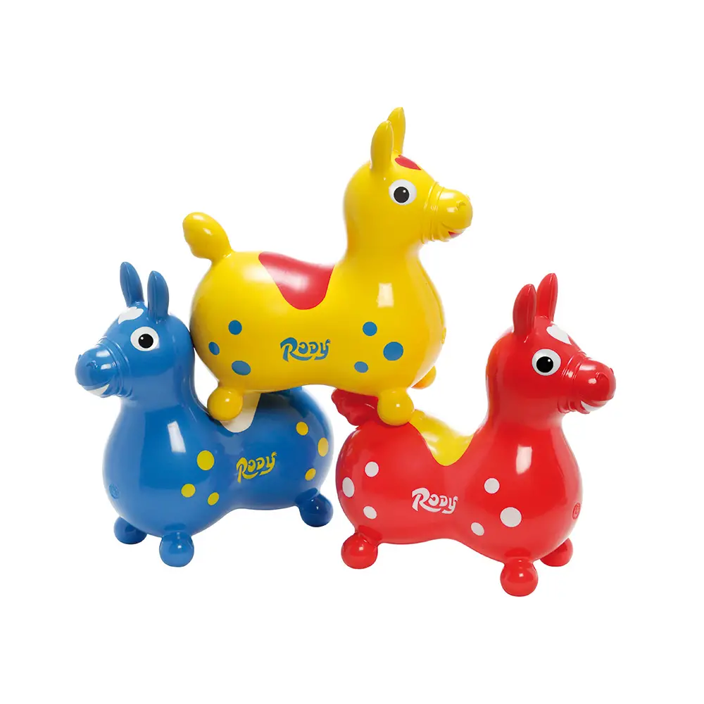 A fun and valuable support for physical activity, the Rody horse develops balance, motor skills and coordination, and improves and harmonizes your child's trunk, leg and arm muscles. Adopted in kindergartens as a psychomotor tool, used by therapists to stimulate skills such as language, memory and perception, the Rody horse is above all an engaging and soothing game, a pleasant and calming entertainment that stimulates group relationships. Appreciated by all children since its appearance on the market in 1984 for its rounded design and its qualities of elasticity and softness, this product rightfully enters the category of evergreen. Thanks to the removable bases (not included) you can transform Rody into a rocking horse or one on wheels!
