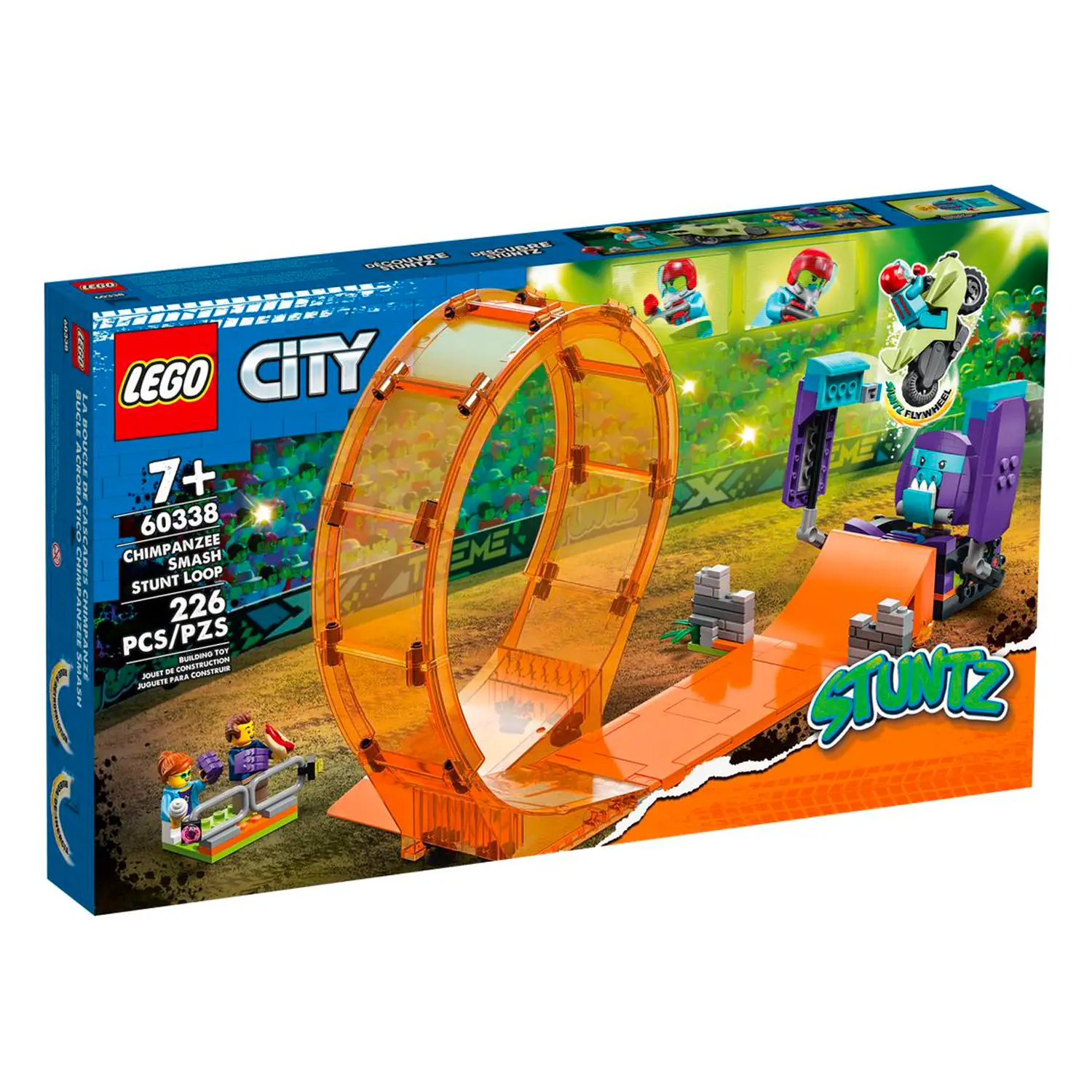 Questo set LEGO City Stuntz contiene un percorso acrobatico con giro della morte e trampolino di lancio, uno scimpanzé meccanico per lo stunt show e una moto giocattolo con la funzione “carica e vai”
