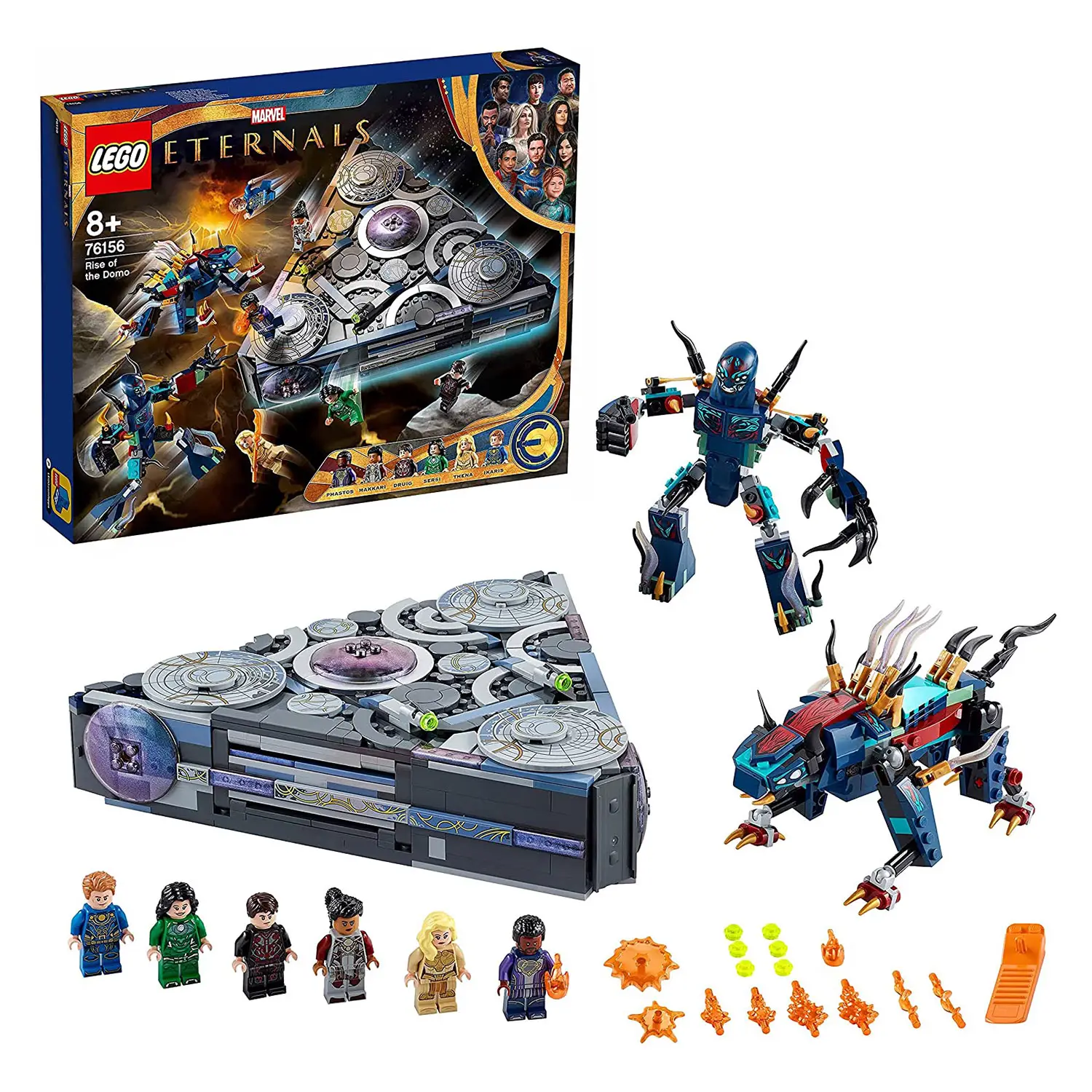 Il set include 6 minifigure di Makkari, Ikaris, Thena, Sersi e gli esclusivi Druig e Phastos, 2 personaggi d’azione dei Deviant, tra cui Kro, il leader dei Deviant, un’astronave, armi e accessori.