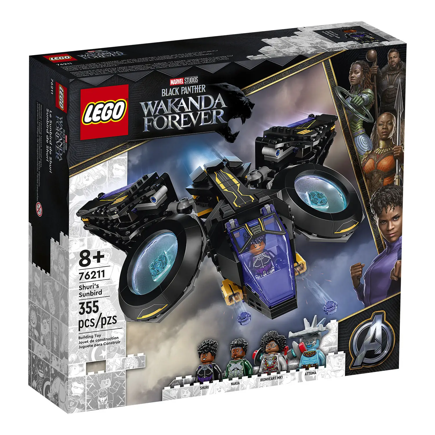 Quattro personaggi: include le minifigure di Shuri, Ironheart MK1, Nakia e Attuma, oltre a una lancia, anelli da combattimento e jetpack. Il Sunbird costruibile è dotato di 2 shooter, motori rotanti e ali pieghevoli