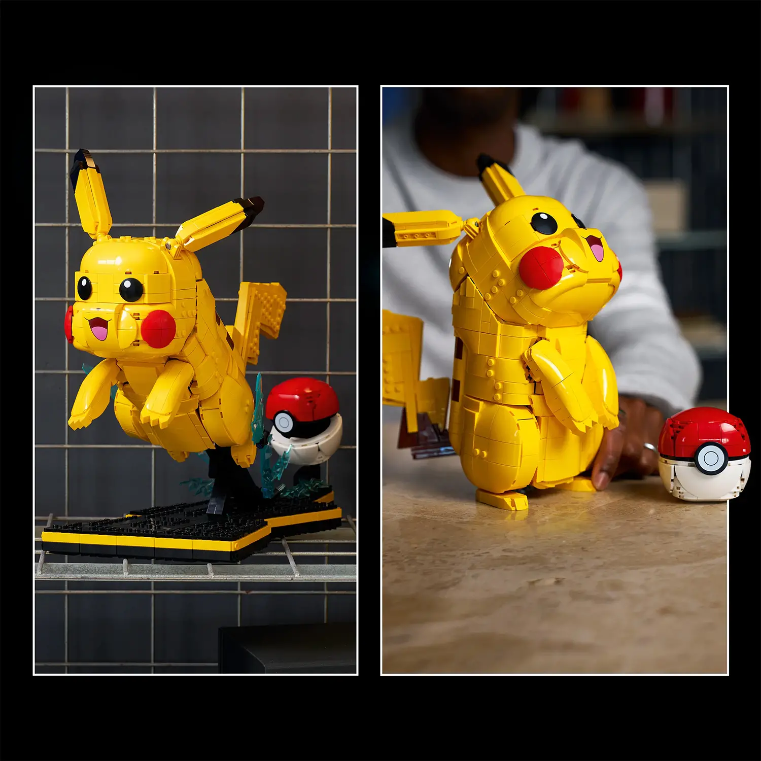 Poké Ball costruibile e base espositiva Il set include una Poké Ball apribile e richiudibile, che funge da elemento scenografico. La base presenta dettagli come il numero “25”, riferimento al Pokédex, e supporti a forma di fulmine che richiamano il tipo Elettro del personaggio.
