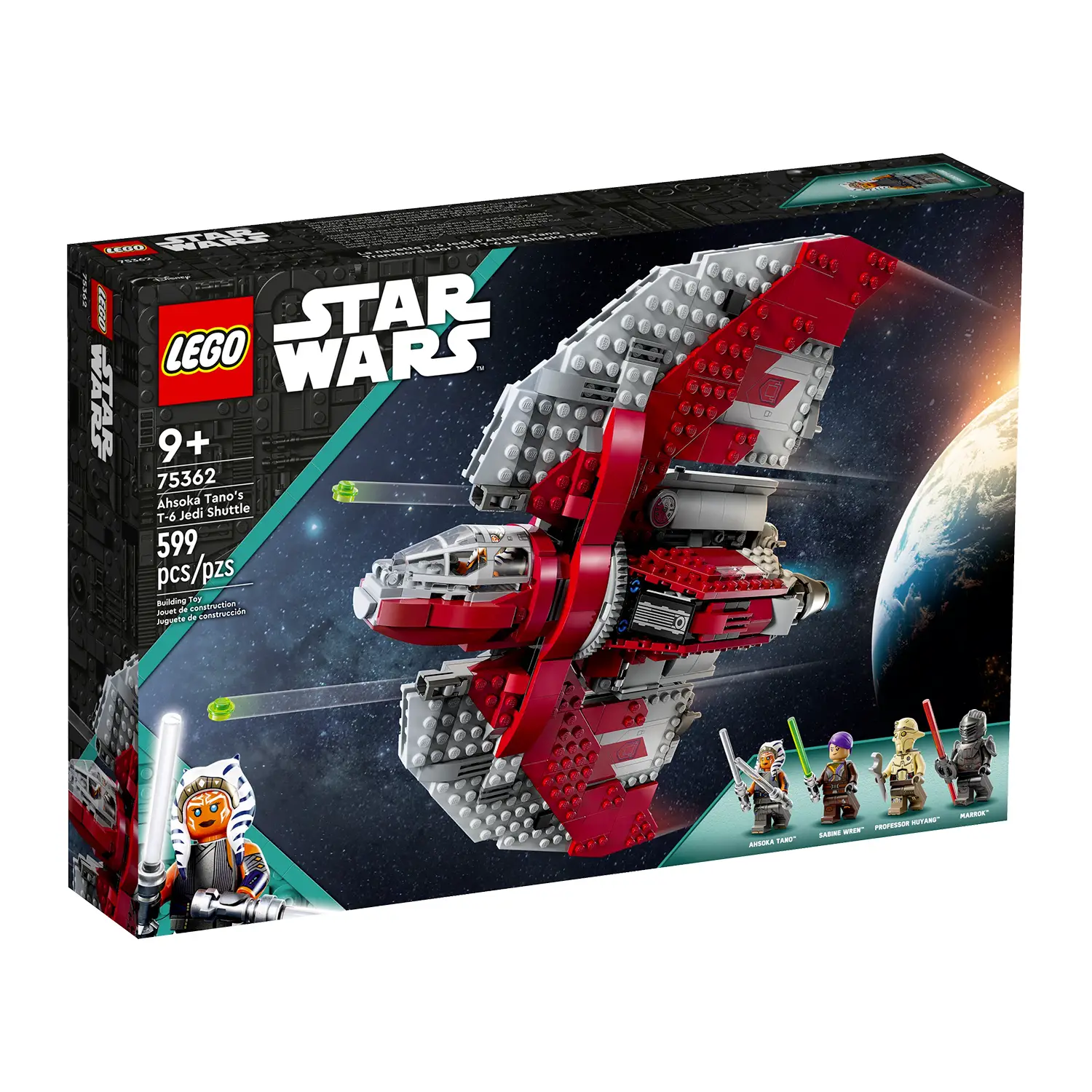 The buildable spaceship model features an opening cockpit for the LEGO minifigure, retractable landing gear for flight mode, 2 shooters and 2 holds for tools and weapons. The box includes 4 LEGO Star Wars minifigures: Ahsoka Tano with 2 lightsabers, Sabine Wren with 2 blasters, Professor Huyang with wrench and Marrok with a double-bladed lightsaber.