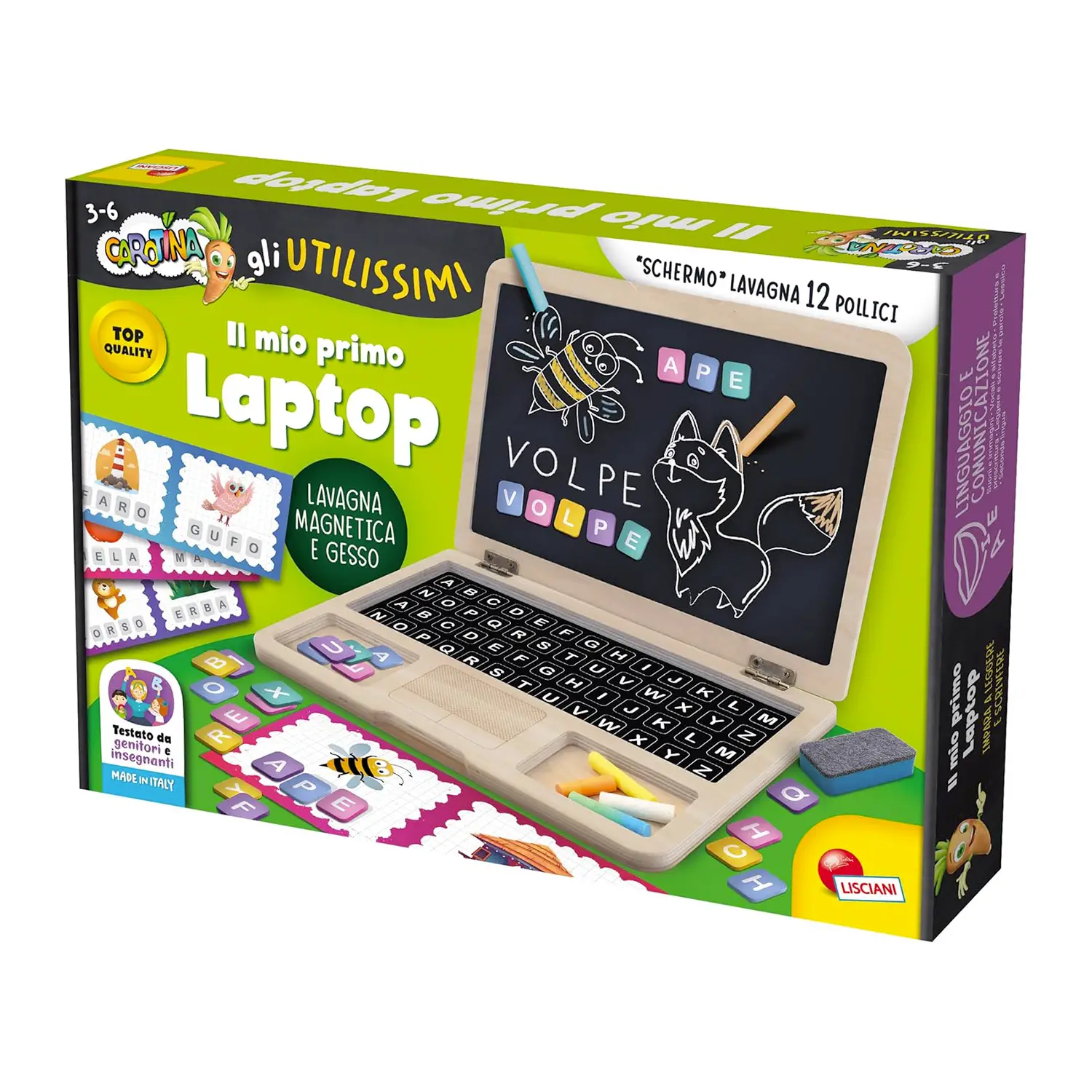 Set completo per l’apprendimento Include laptop in legno, lettere magnetiche, schede parole, gessetti, cancellino e istruzioni.