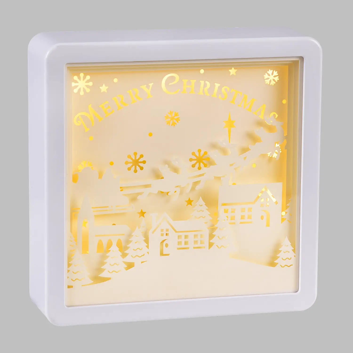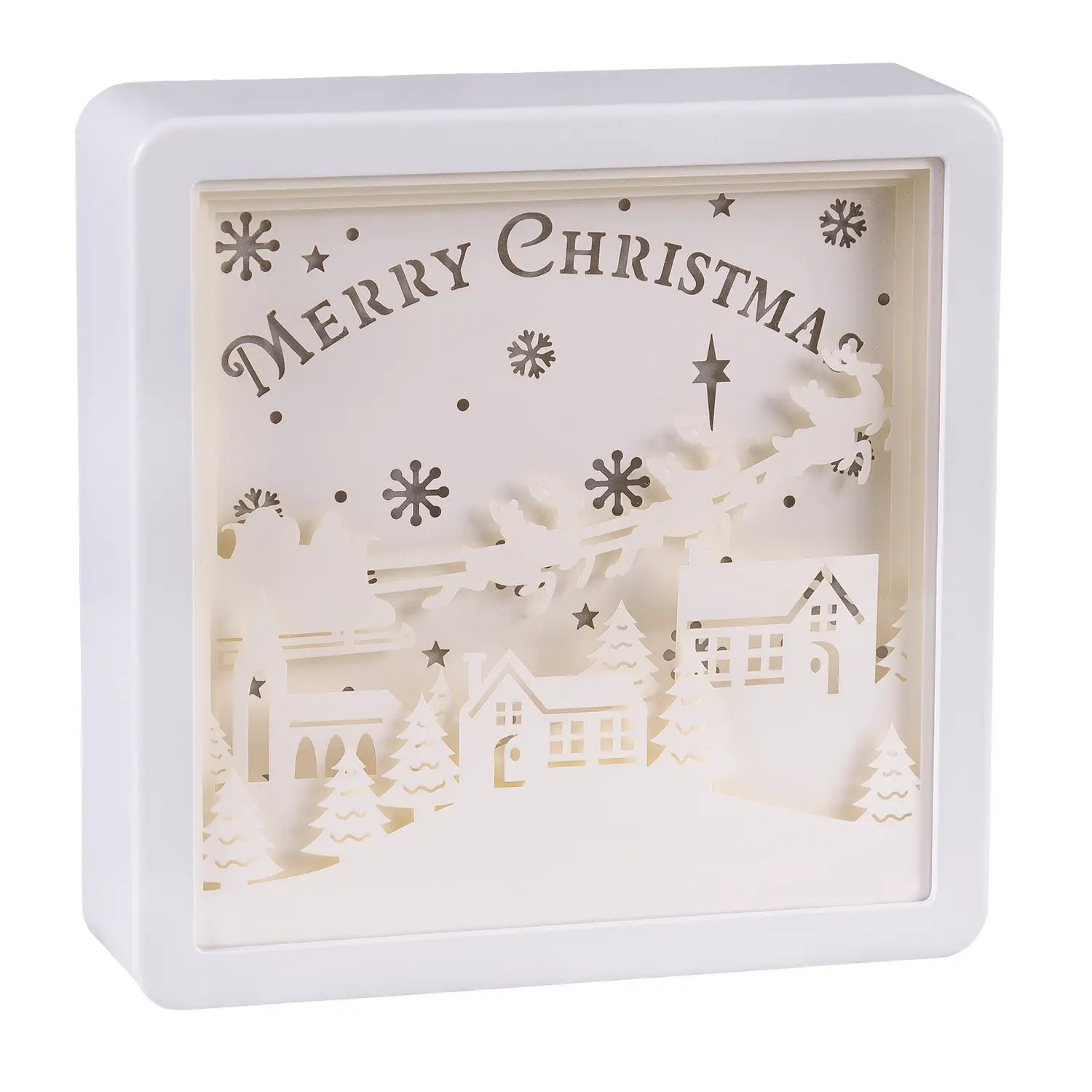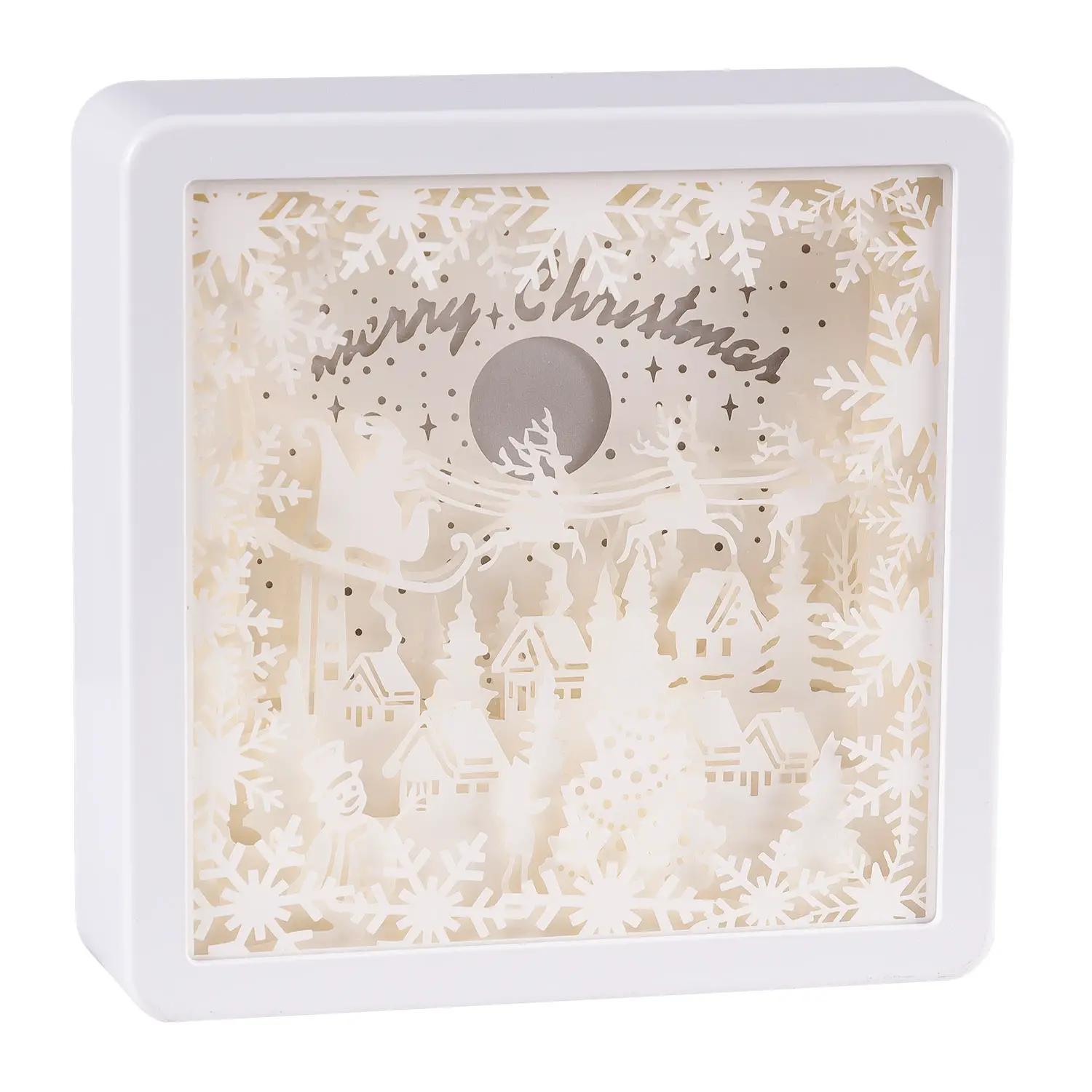 Decorazione natalizia da interno con luce LED: Elegante silhouette Papercut in plastica bianca, perfetta per arredare con stile ogni ambiente domestico nel periodo natalizio.