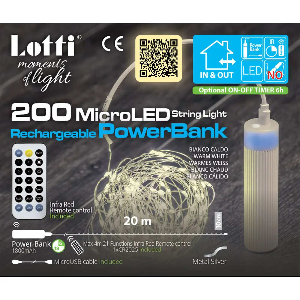 Luci di Natale Lotti - Catena 200 Micro Led Bianco Caldo con Power Bank - Filo Silver da 20 metri