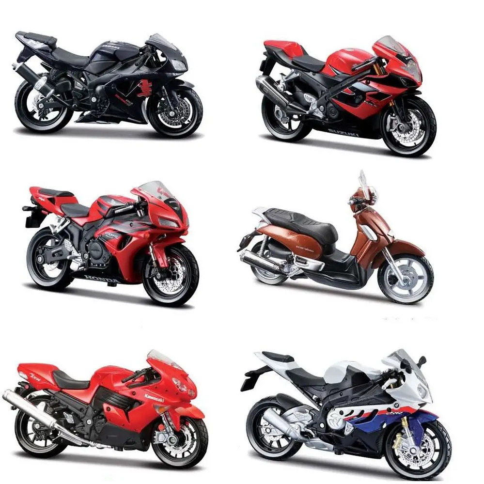 - ✅ Assortment with 6 models: Yamaha YZF-R1, Suzuki GSZ R1000, Honda CBR 1000RR, Aprilia Scarabeo 500, Kawasaki Ninja ZX-14R, BMW S1000RR.