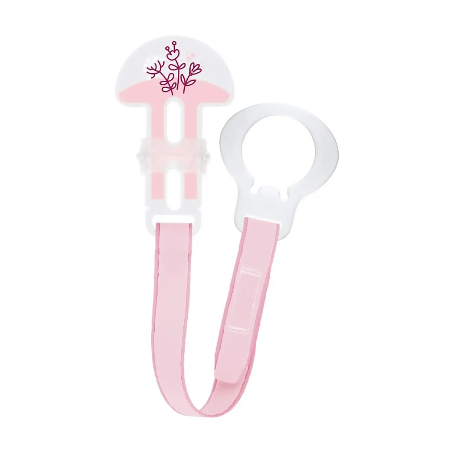 Soother saver designed to fit all clothes. Clip-on mechanism avoids the use of needles and pins. Teat cover keeps it clean and protected. Ribbon length keeps the pacifier easy to grip. Silicone ring fits all pacifiers