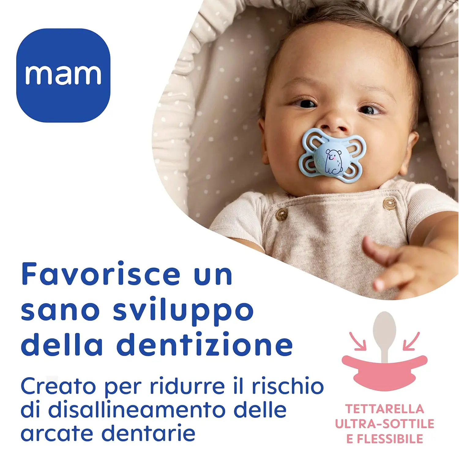 Benefici confermati clinicamente Studi a lungo termine dimostrano che il MAM Perfect riduce significativamente il rischio di disallineamento dentale rispetto ai ciucci tradizionali. Una scelta sicura e supportata scientificamente per la salute orale del tuo bambino.