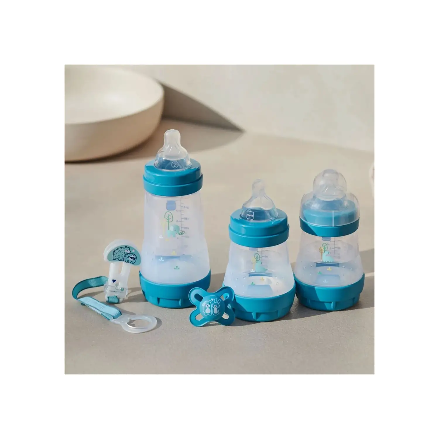 Set completo per la prima infanzia Il MAM Welcome to the World Set include 2 biberon Easy Start Anti-Colic da 160 ml, 1 da 260 ml, 1 ciuccio Original Start e 1 clip portaciuccio, offrendo tutto il necessario per i primi mesi.
