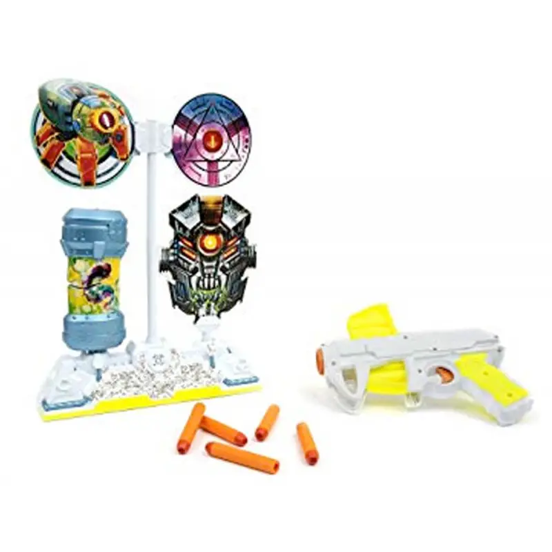 - Contenuto della Confezione: Pistola a dardi, 3 bersagli interattivi, 6 dardi in spugna