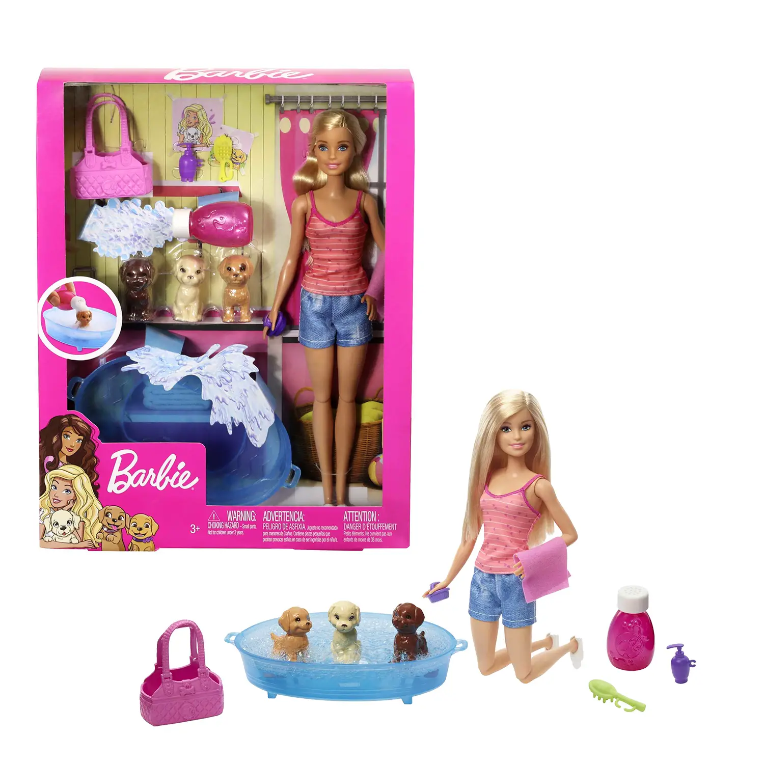 - ✅ Includes jointed Barbie, 3 puppies, bathtub, 2 shampoo bottles, brushes, towel and carrying bag