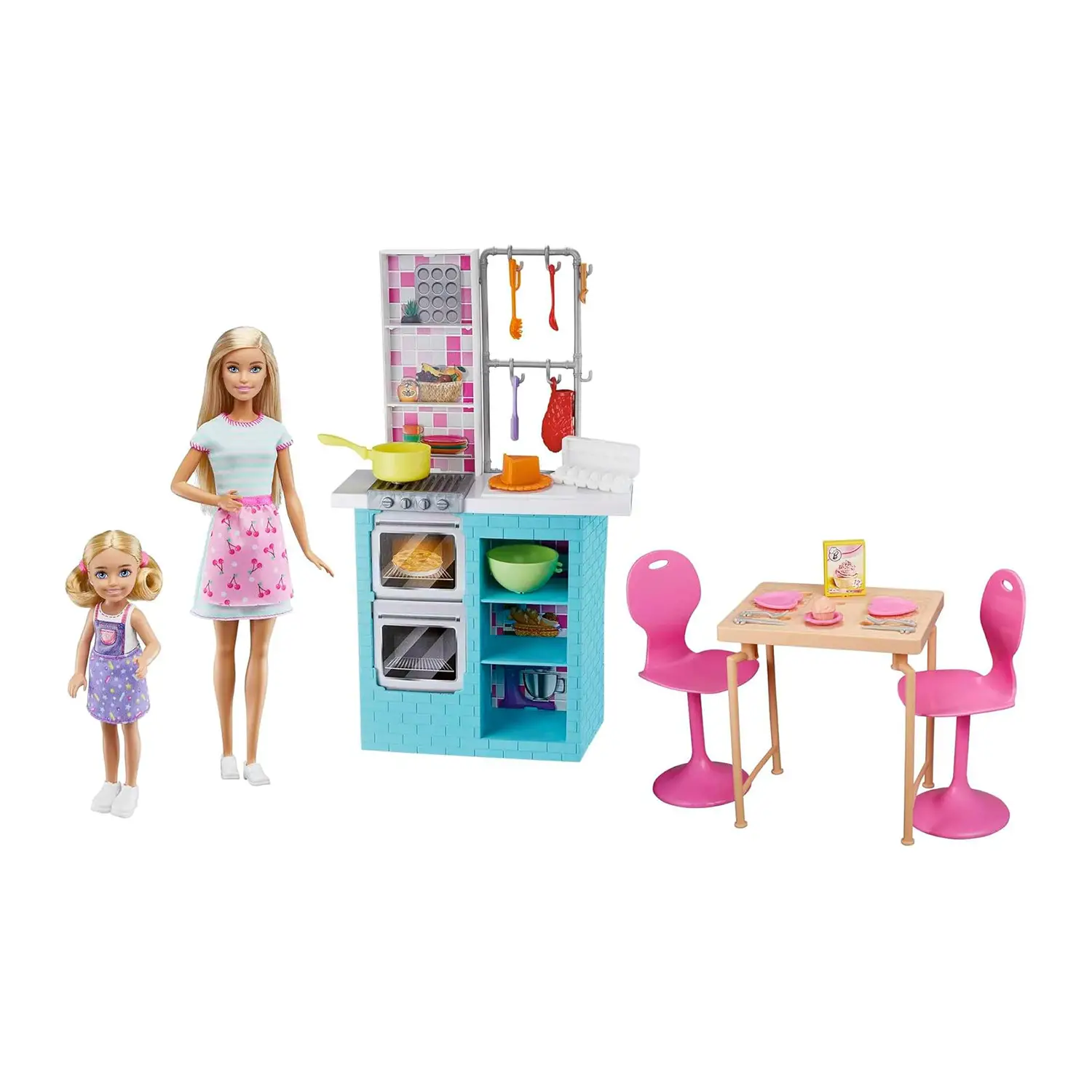 Barbie & Chelsea Set for Sweet Adventures in the Kitchen. This Barbie Sisters Baking playset is perfect for recreating creative playtime. It includes Barbie and Chelsea dolls, a kitchen with a double oven and more than 15 accessories to make delicious treats.