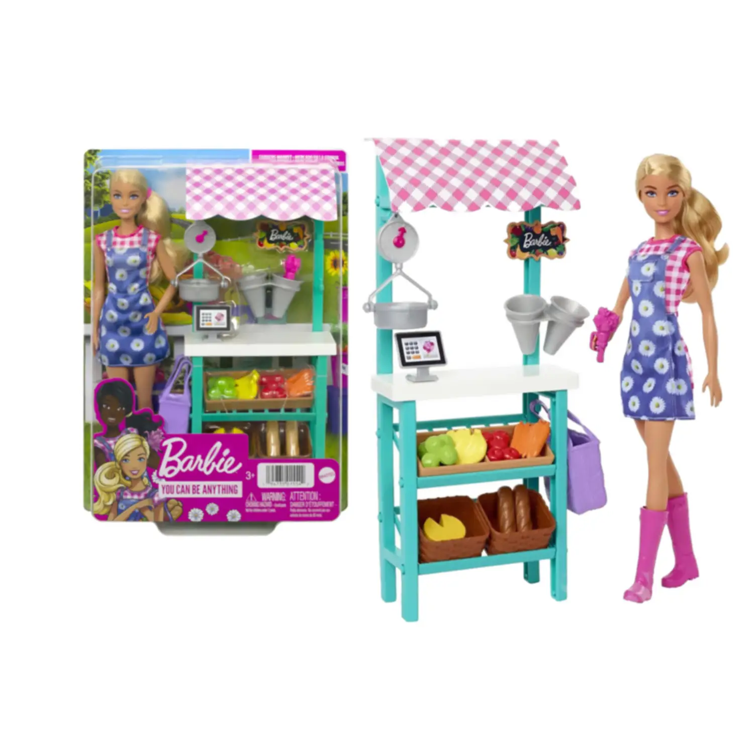 - ✅ Playset Barbie Farmers Market con bambola Barbie alta 11,5 pollici, vestita con abito a quadretti, grembiule a fiori e stivali rosa.
