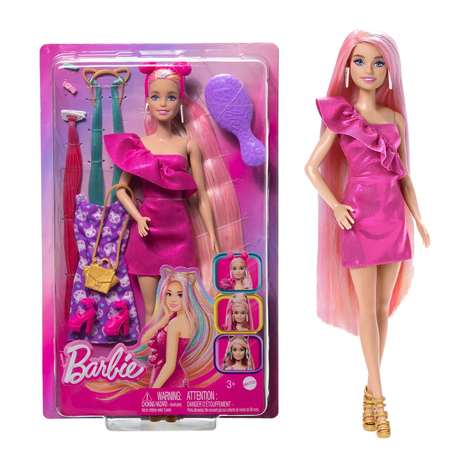 Outfit glamour intercambiabili La bambola indossa un miniabito rosa lucido con orecchini bianchi e scarpe dorate con cinturini. Il set include anche un secondo abito con stampa a forma di gatto, un paio di scarpe col tacco aggiuntive e una borsetta per cambiare stile in pochi gesti.