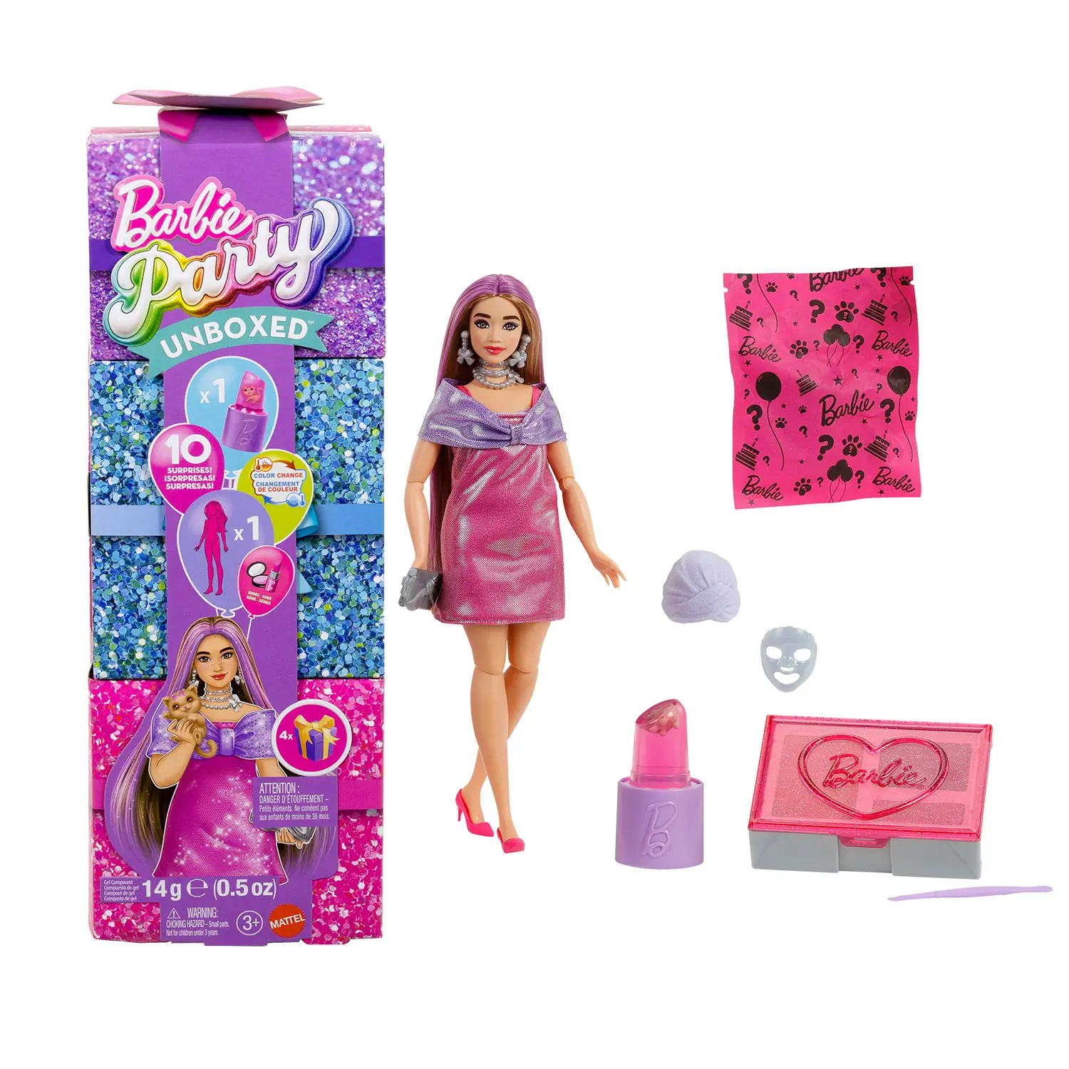Barbie Party Surprise Festa Glamour Barbie Party Surprise rosa brillante trasforma l’unboxing in un’esperienza di gioco coinvolgente. Con 10 sorprese da scoprire, questo playset stimola curiosità e immaginazione, permettendo a bambine e bambini dai 3 anni di preparare Barbie per una festa glamour.