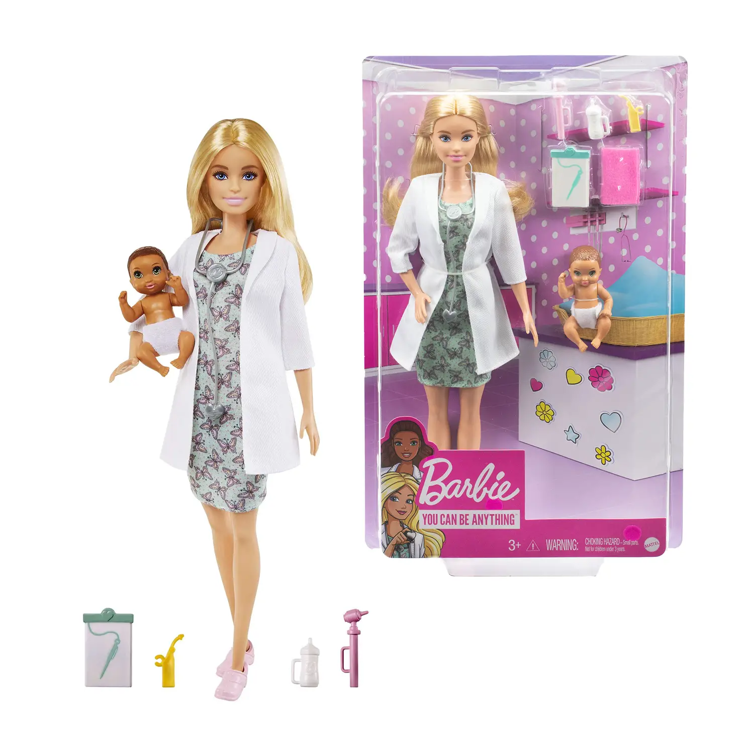 Everything you need for a full examination Barbie wears an elegant butterfly dress and white doctor's gown and is ready to take care of the little one with realistic instruments such as stethoscope, thermometer, oscilloscope, baby bottle, pink blanket and medical records.