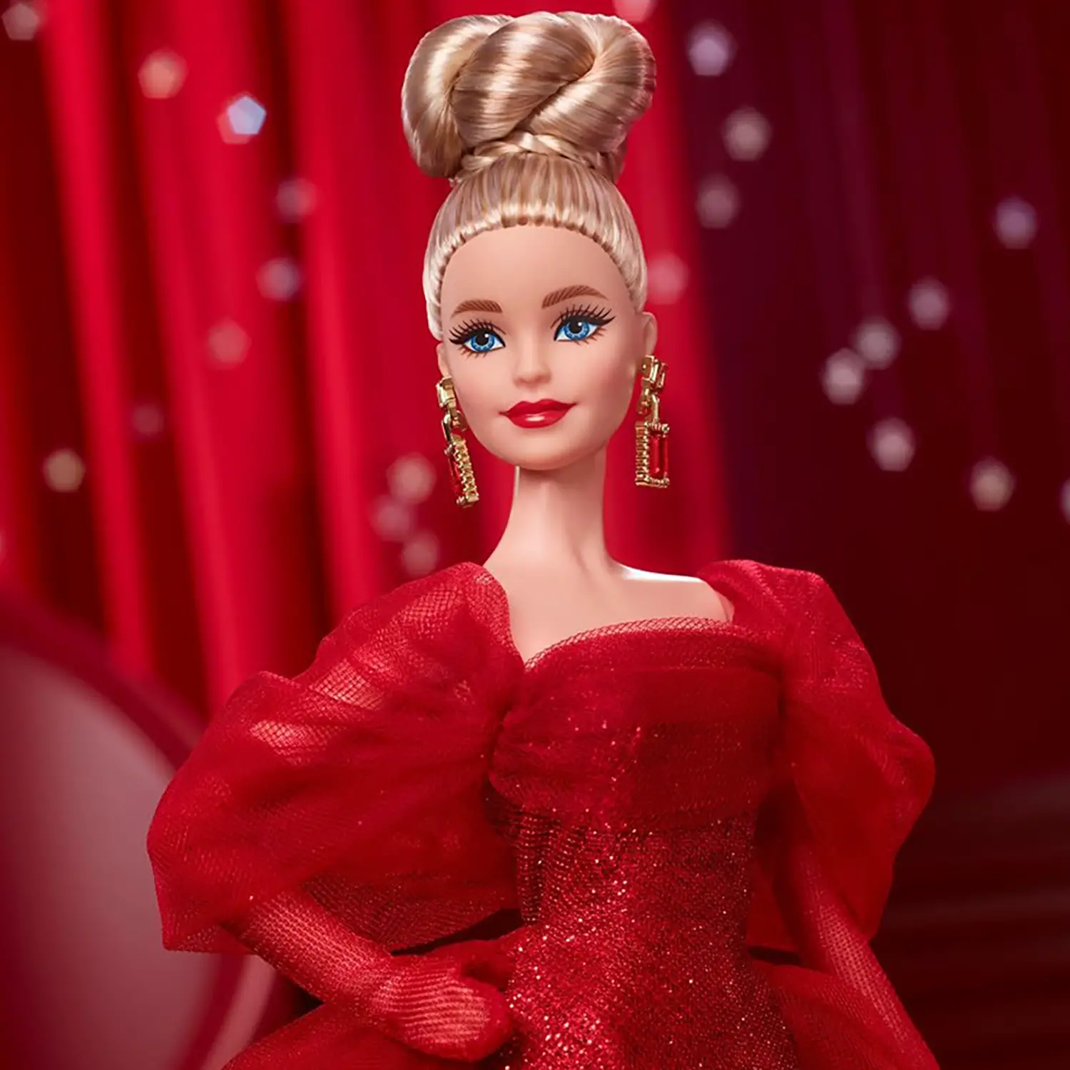 Abito rosso scintillante da tappeto rosso L’abito in tulle rosso, con maniche a fiocco e strascico, rende questa Barbie protagonista assoluta, ideale per essere esposta in collezione o regalata in occasioni speciali.