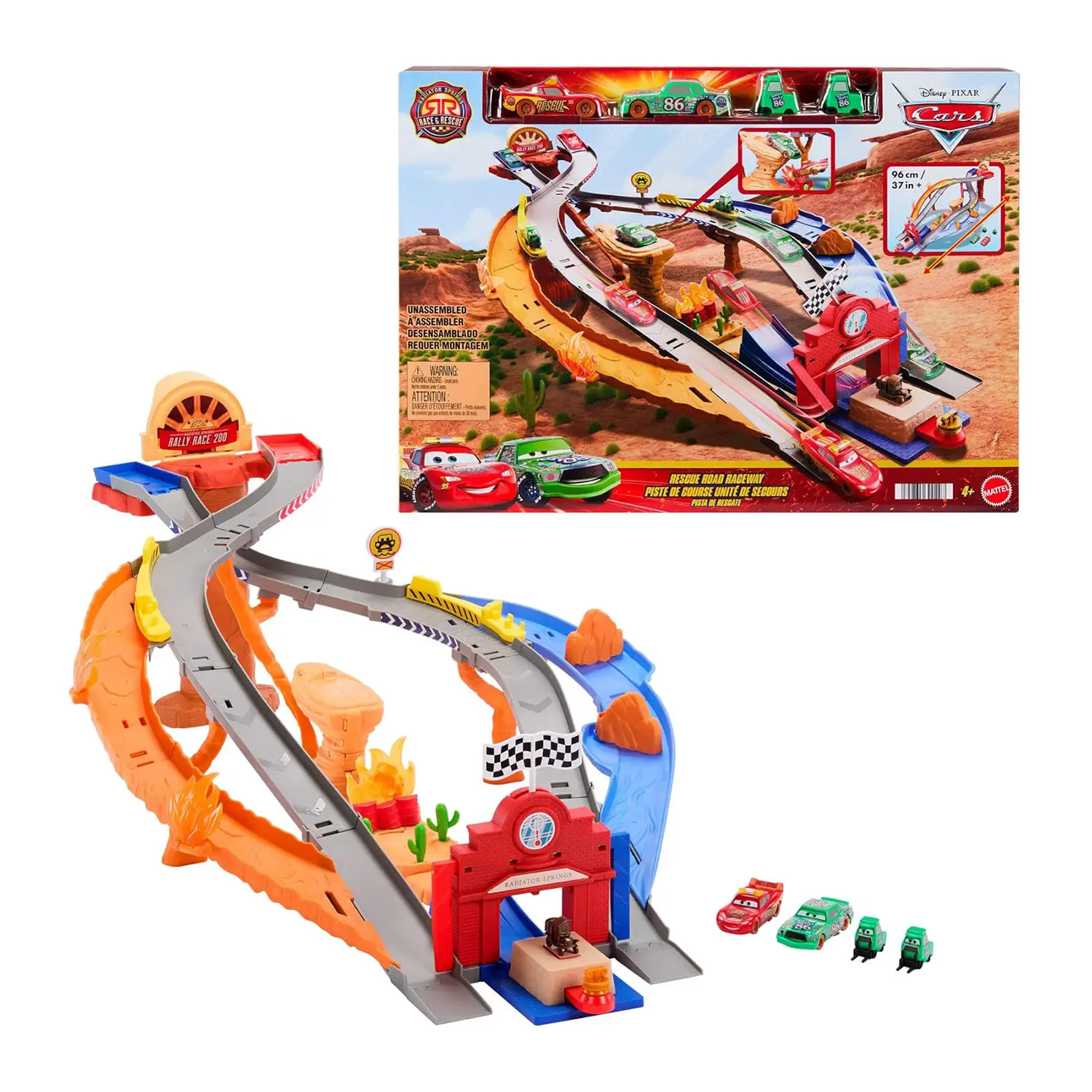 Inspired by Disney and Pixar's Cars The Dart and Rescue - Road Rescue Track set brings the action of Radiator Springs into the hands of children. Lightning McQueen and Chick Hicks are ready to battle it out in an adventure full of surprises and excitement, straight from the world of Cars.