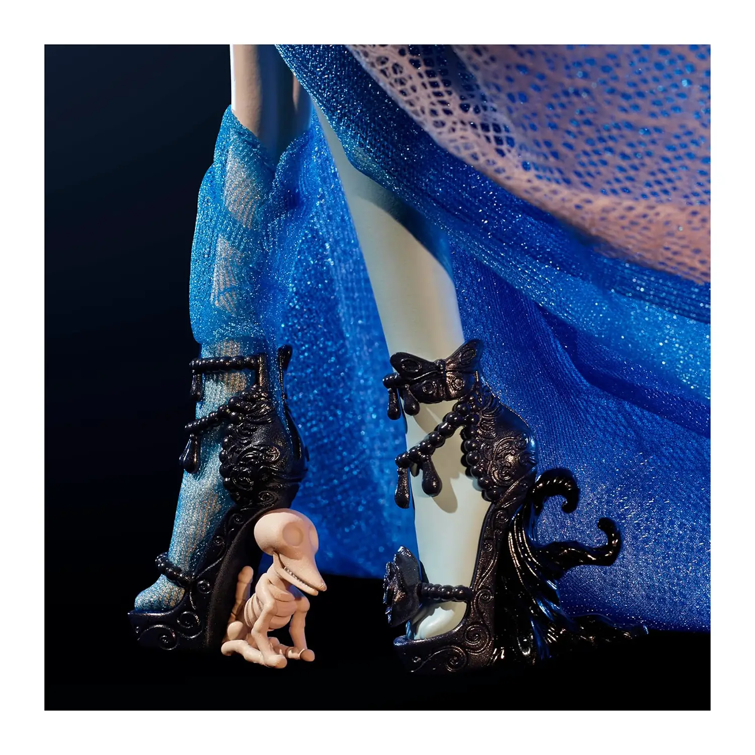Debutto di Emily La Sposa Cadavere Emily La Sposa Cadavere fa il suo debutto con Monster High Skullector. Questa bambola unica è perfetta per chi ama il gotico e il mistero. Abito da Sposa Gotico Emily indossa un abito da sposa gotico mozzafiato. Realizzato in tessuto a tela di ragno trasparente, rivela un incantevole tulle blu. Dettagli Eterei e Unici Il velo trasparente con farfalle, Maggot sulle orecchie e l’anello dorato completano il look di Emily, rendendola unica. Scarpe e Confezione Spettrale Le scarpe con perline nere e dettagli unici sono racchiuse in una confezione affascinante, perfetta per collezionisti e fan del film.