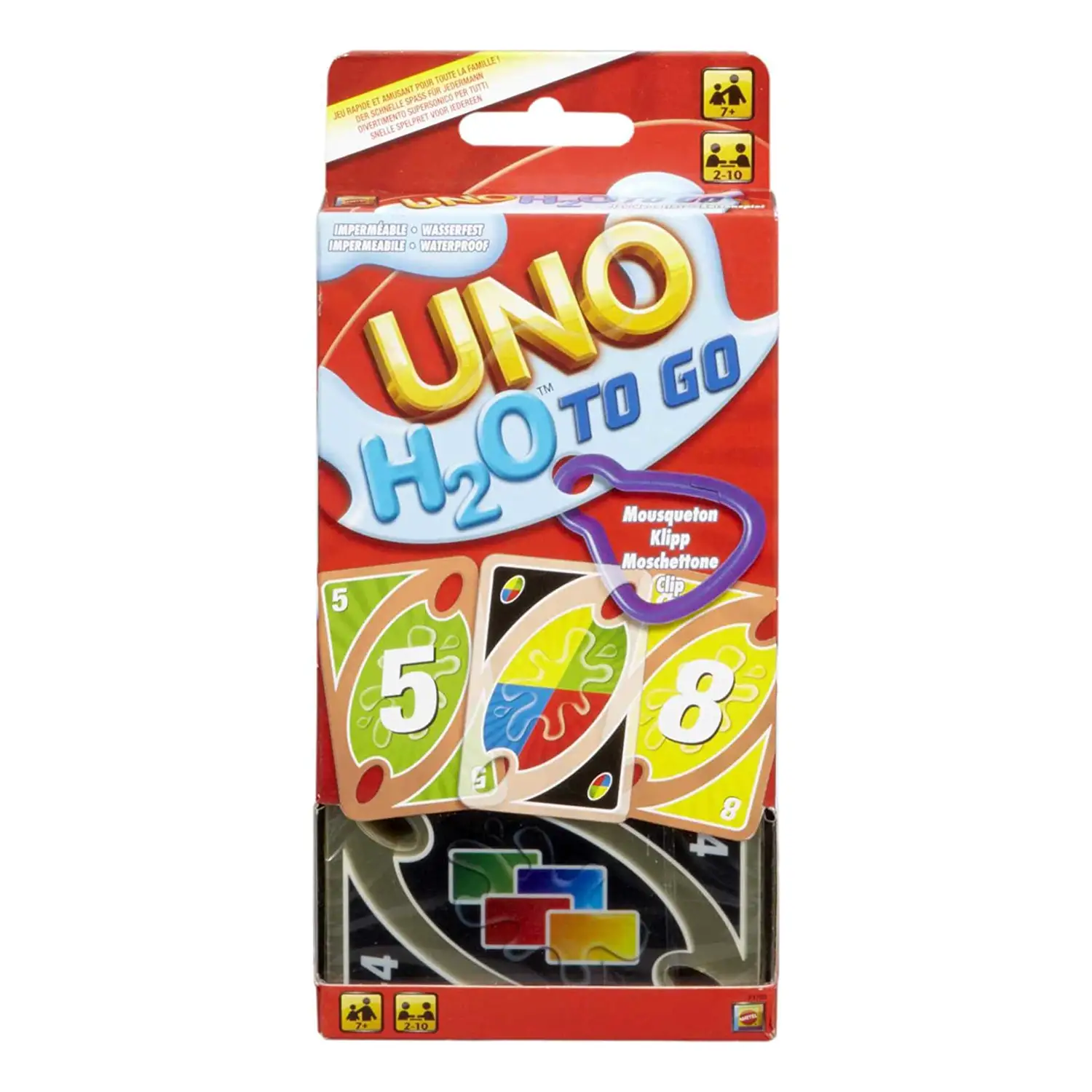 - Contenuto: mazzo di carte UNO H2O in plastica, clip per portarle ovunque