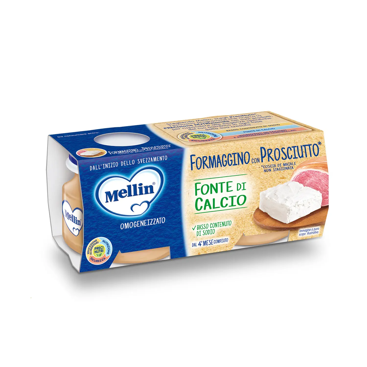 Baby Formaggino Mellin con Prosciutto è ideale per l’alimentazione del bambino perché: - È a base di formaggio fresco - Contiene il 4% di Grassi - È senza coloranti e conservanti, come prescritto dalla legge - Unisce la consistenza cremosa del formaggio al gusto delicato del Prosciutto - È senza glutine