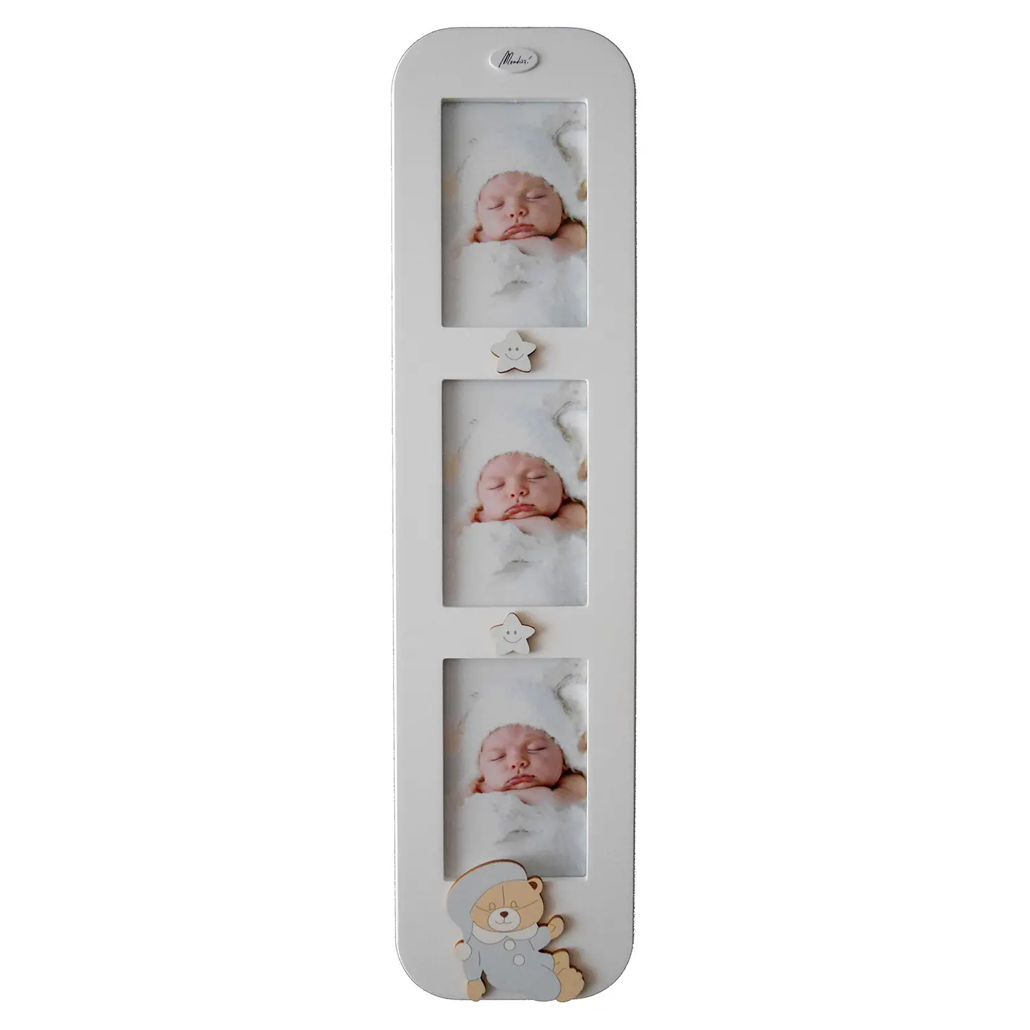 Cornice verticale con 3 spazi per foto, decorata con l’adorabile orsetto Cielo, per un tocco romantico e tenero nella cameretta del bambino.