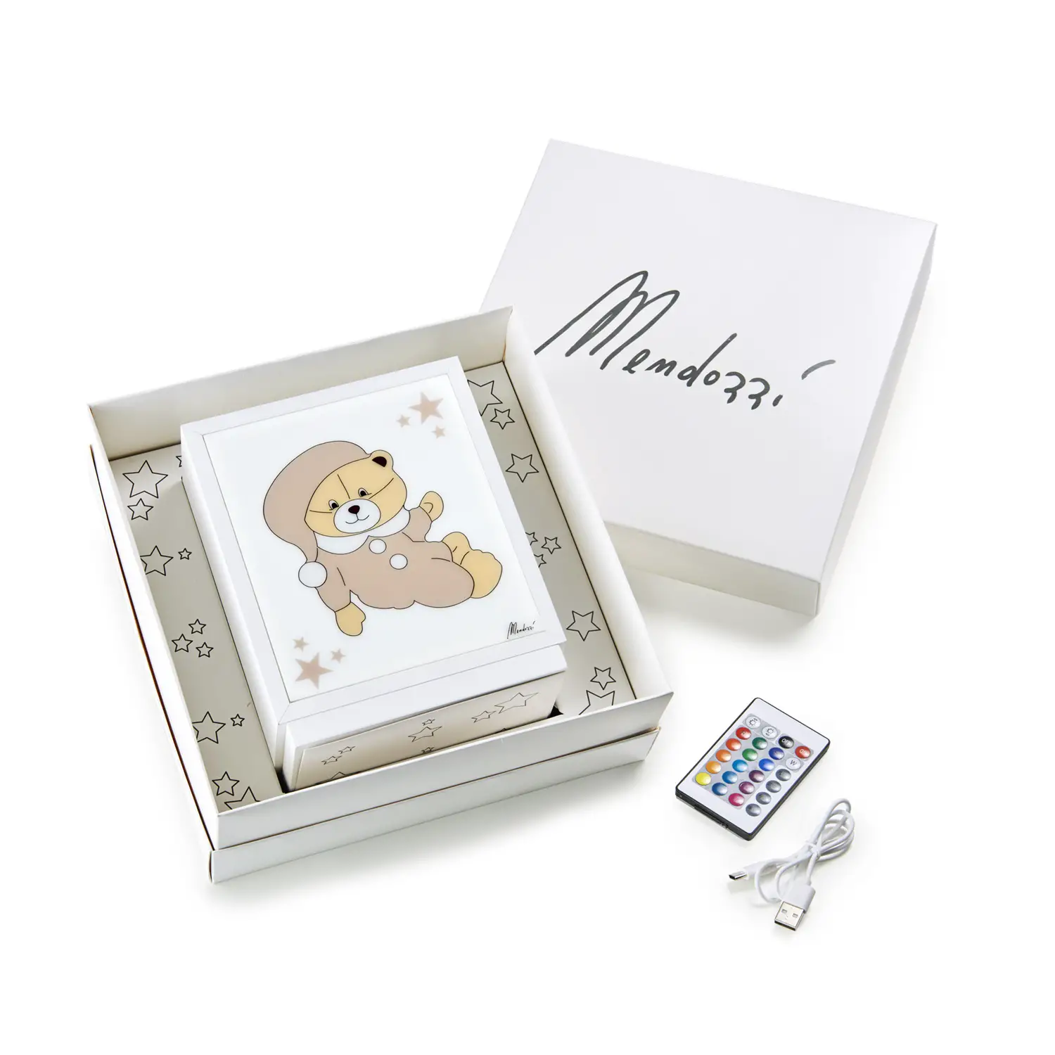 Confezione regalo elegante La scatola firmata Mendozzi, impreziosita da decorazioni a stelle, rende questa lampada un’idea regalo perfetta per nascita, battesimo o compleanno.