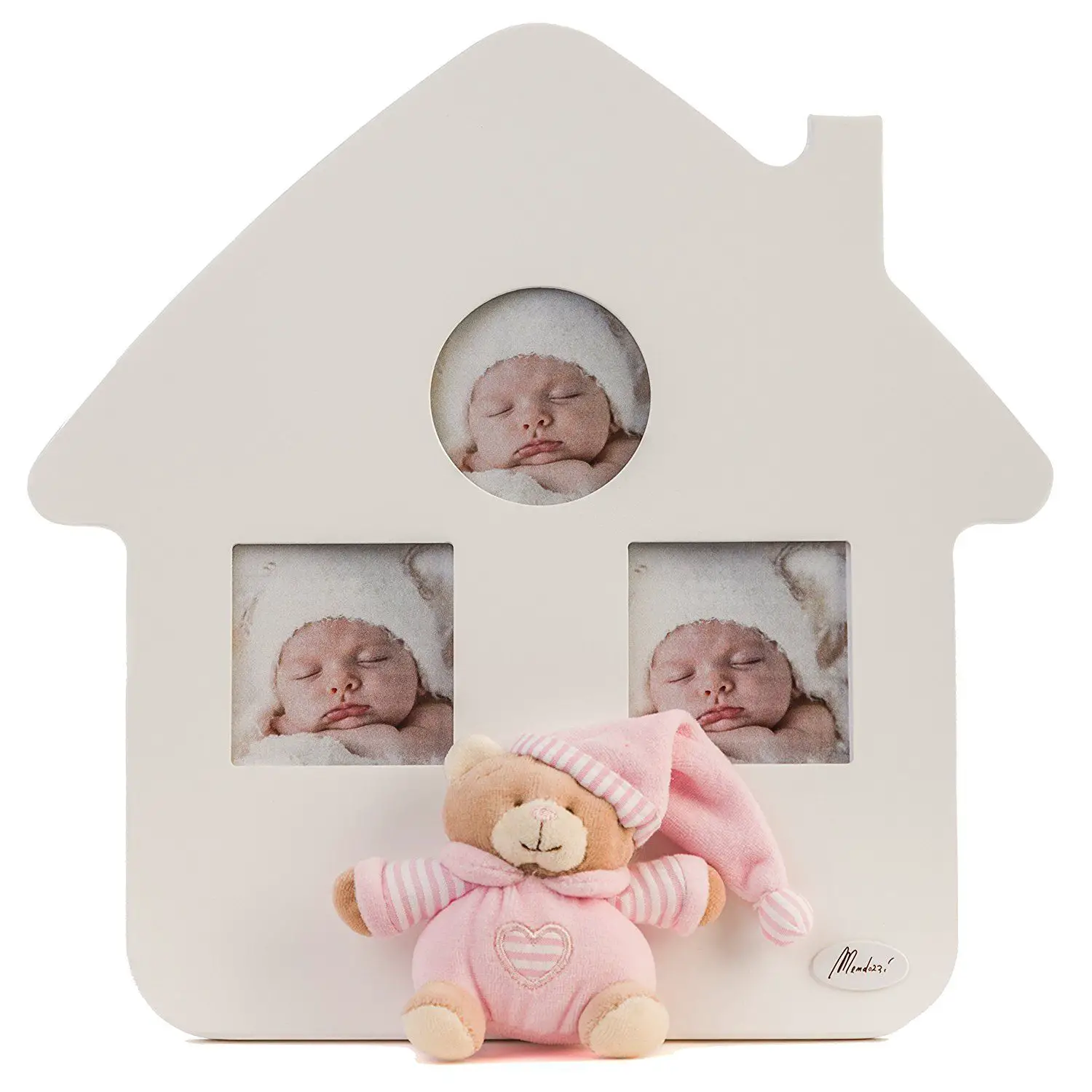 WHITE LITTLE HOUSE 3 PHOTO HOLDER WITH PINK FABRIC BEAR