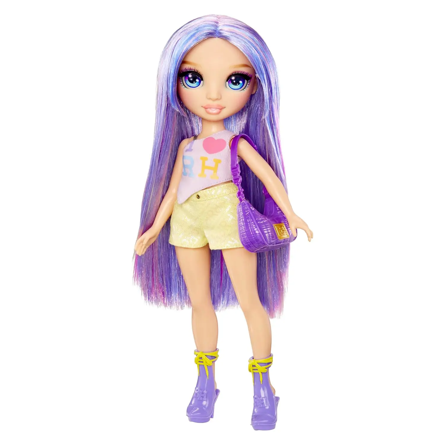 Stile unico – Violet si distingue per il suo look viola glamour con top I Love RH, shorts arcobaleno iridescenti, tacchi vistosi e borsa viola coordinata.