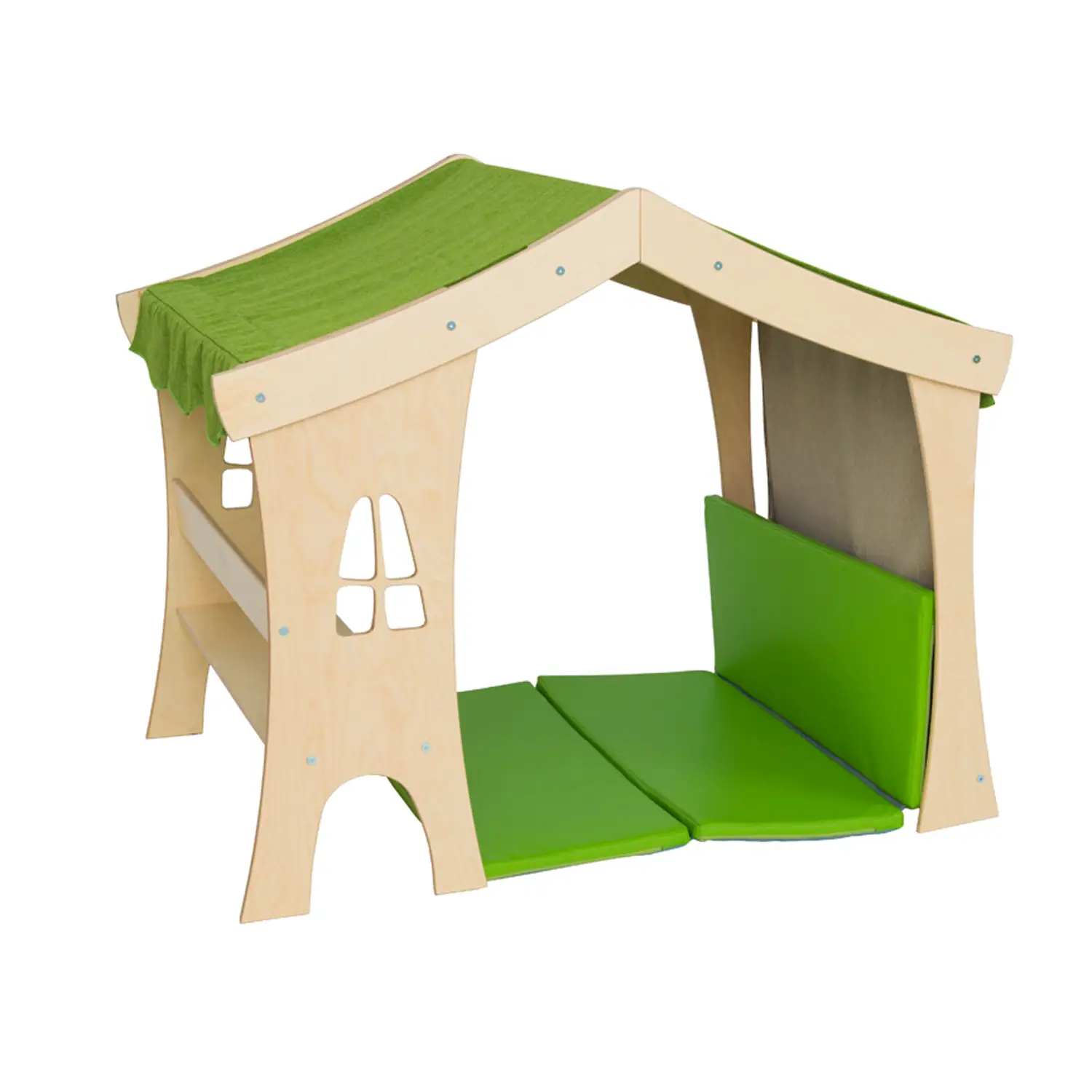 Casetta per bambini realizzata in resistente multistrato di betulla da 15 mm, con tetto e parete laterale in speciale tessuto di poliestere Tornado nei toni verde e beige. La struttura solida e l’aspetto accogliente rendono questa casetta ideale per creare spazi protetti all’interno di aule scolastiche, biblioteche, ludoteche o ambienti domestici. Le dimensioni generose permettono l’utilizzo da parte di più bambini contemporaneamente, favorendo l’interazione e la condivisione. Al suo interno è integrata una comoda panchetta a 2-3 posti.