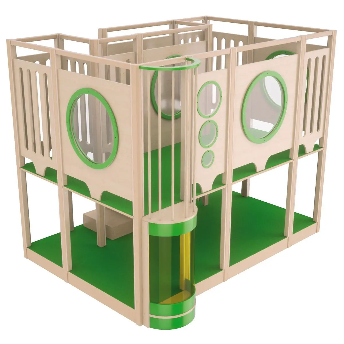Completo angolo gioco in conglomerato ligneo laminato e multistrato verniciato al naturale con finitura trasparente atossica, angoli e bordi arrotondati.