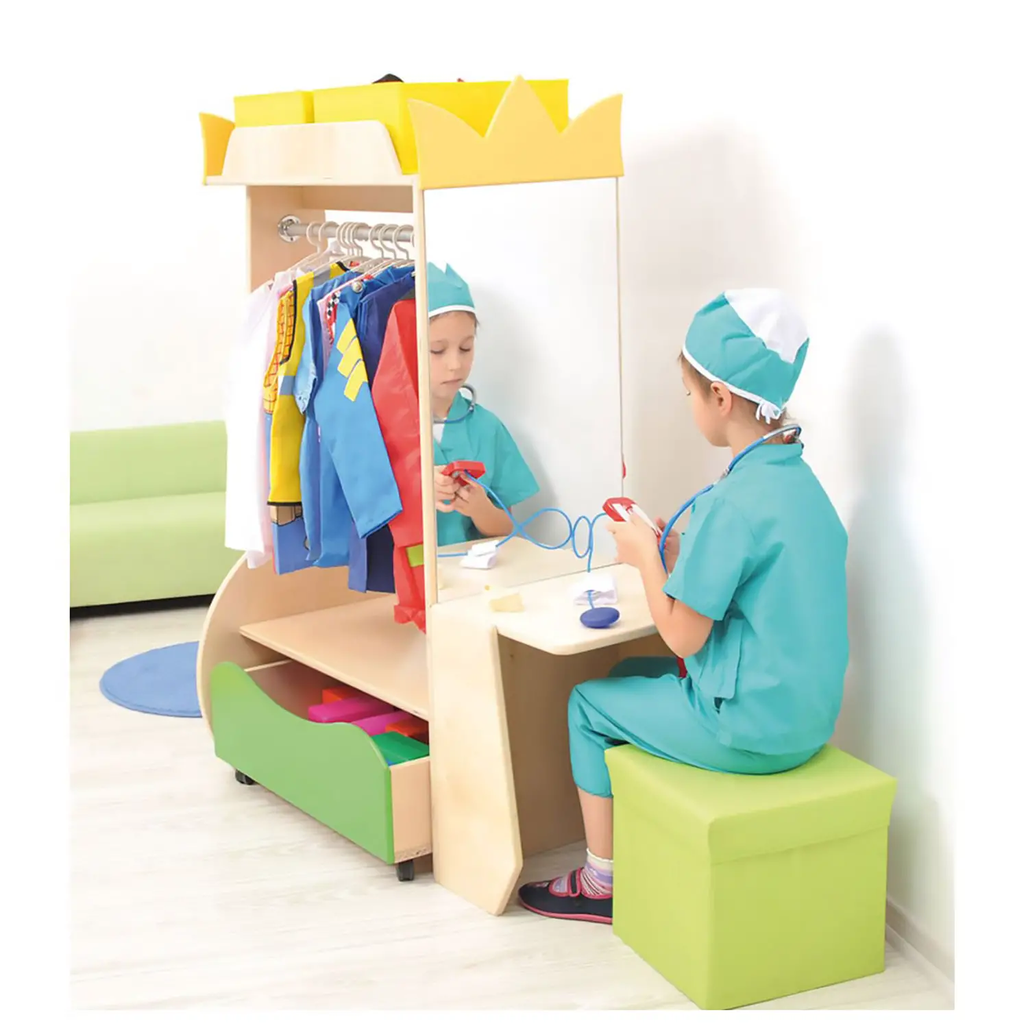 Design Multifunzione: Oltre ad essere un contenitore per travestimenti, il mobile è arricchito da un carrello contenitore, ideale per conservare ulteriori accessori, e uno scrittoio laterale con specchio, permettendo ai bambini di ammirare i loro travestimenti.