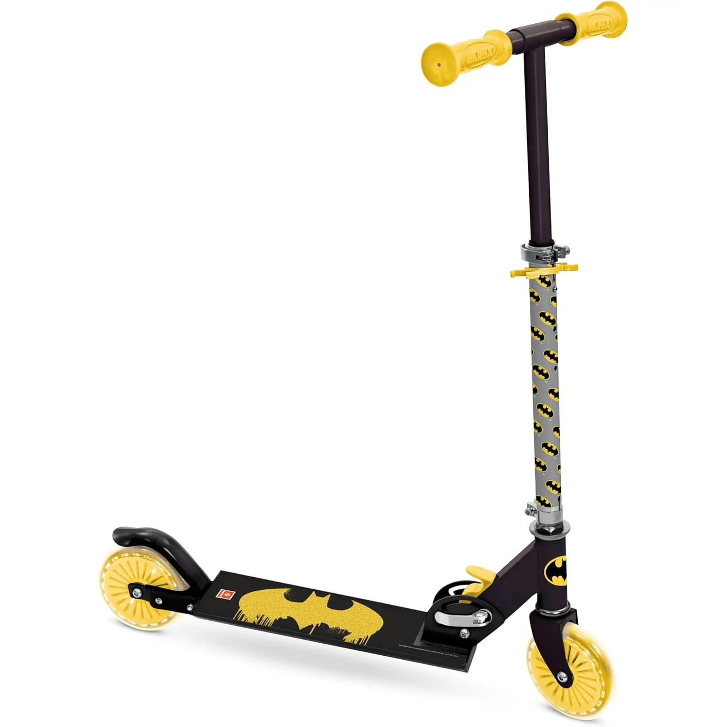 Monopattino 2 Ruote Batman Pieghevole Il Monopattino 2 Ruote Batman di MONDO è pieghevole con chiusura a scatto, permettendoti di trasportarlo facilmente ovunque tu vada. Struttura Leggera e Maneggevole Questo monopattino presenta una struttura leggera in alluminio resistente, rendendolo facile da manovrare e supporta un peso fino a 50 kg. Stabilità e Sicurezza Potenziate La pedana extra grip e le manopole estraibili offrono stabilità e sicurezza, garantendo una guida sicura su ogni percorso. Ruote Scorrevoli e Manubrio Regolabile Le ruote da 120 mm con cuscinetti ABEC 5 e il manubrio regolabile offrono una guida fluida e adattabile a bambini di diverse altezze.