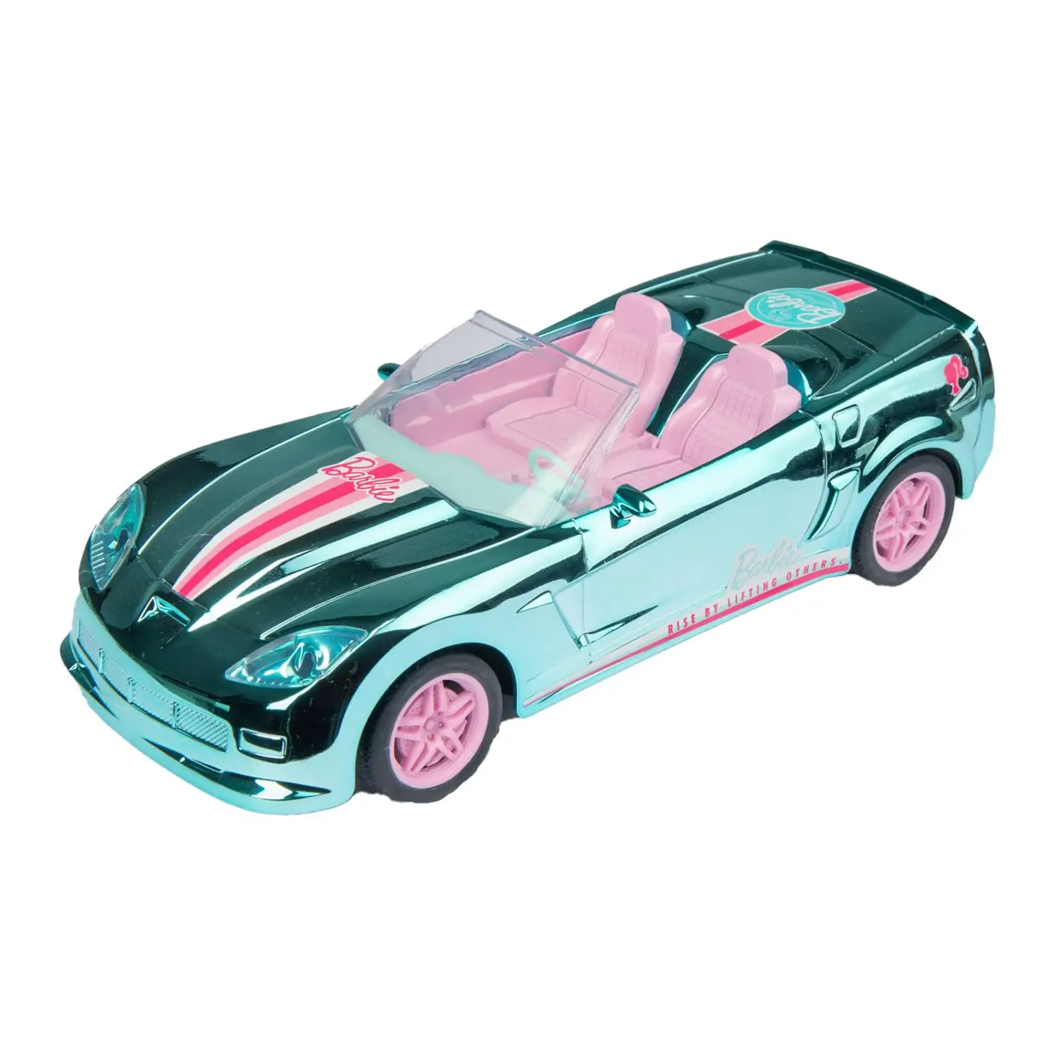 - ✅ 1:24 scale radio-controlled car, official Barbie 65th anniversary, with bright Light Blue Chromed finish.