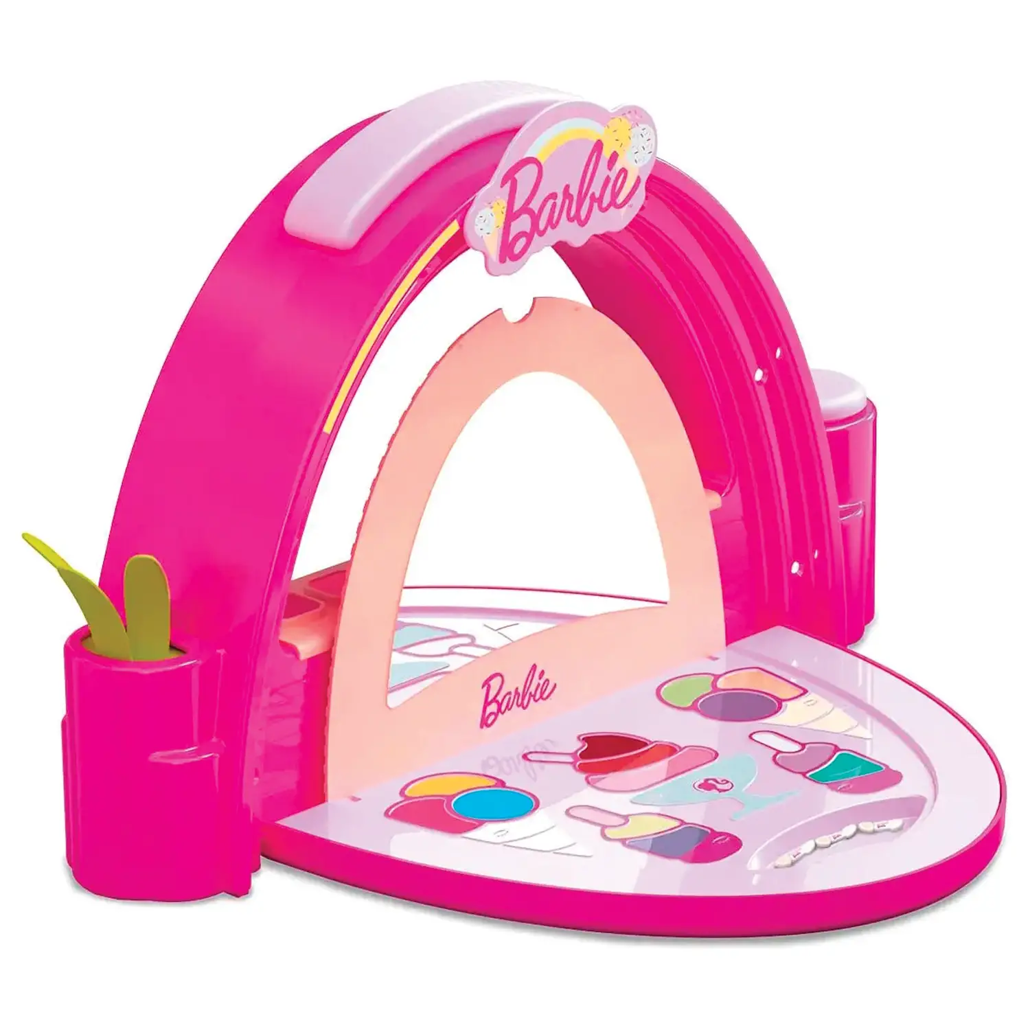 Questo fantastico kit per il trucco di Barbie include 8 lucidalabbra, 4 ombretti compatti, 12 ombretti compatti, applicatori, 5 lime per unghie, specchio e luci a LEDMake-up / Gelateria Barbie Dual-purpose