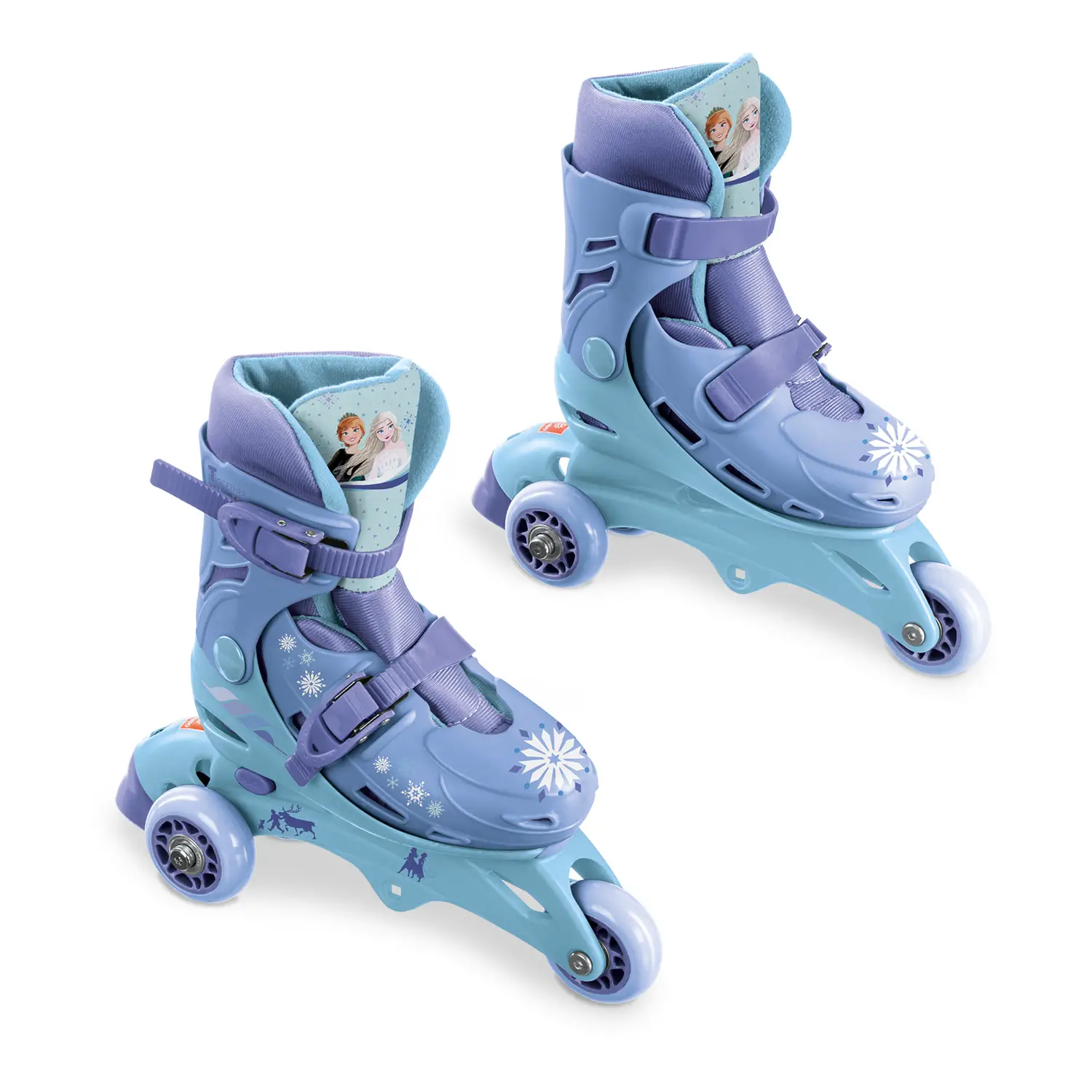 Dual function: from tri-skate to inline skate Adjustable size 29-32 - grows with the child's foot Quick and easy adjustment system - no tools required Fitness boot with articulated knee pad - stability and comfort Rear pad brake - for a safe stop Precision 608Z ball bearings - smoothness and control Disney Frozen design - loved by little girls