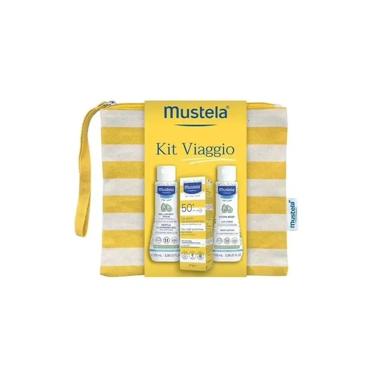- ✅ Kit viaggio Mustela con pochette in cotone 100%, elegante e pratica da portare ovunque.