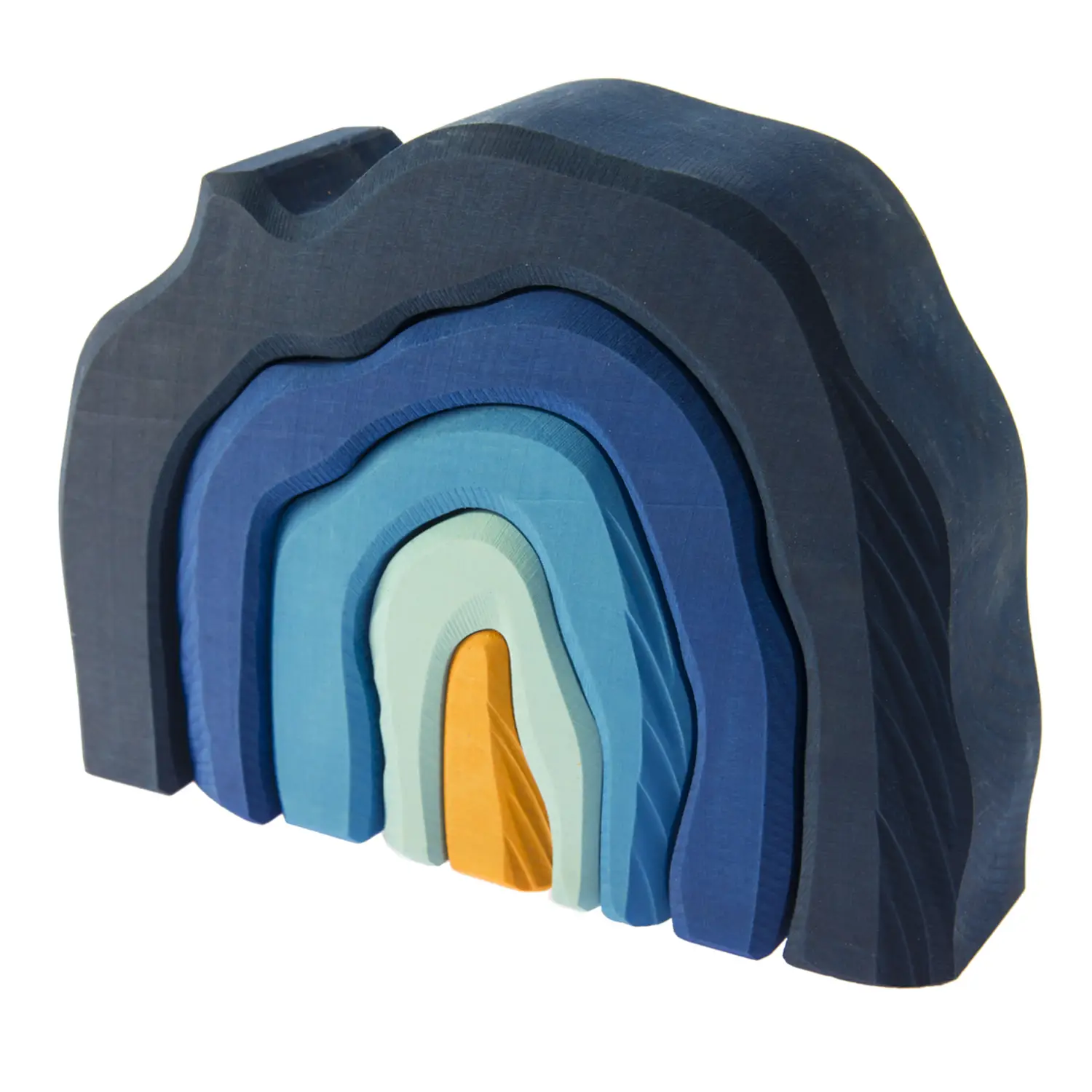 Una bellissima grotta che si forma dall’unione di 5 elementi, che possono essere usati per altre creazioni fantasiose anche in abbinamento ad altri blocchi in legno. Il gioco sarà sorprendente grazie all’effetto colorato che si ottiene e anche per il feedback sensoriale alla manipolazione degli elementi, realizzati con finitura molto particolare piacevolissima al tatto, con vernici all’acqua che non coprono le venature superficiali del legno.