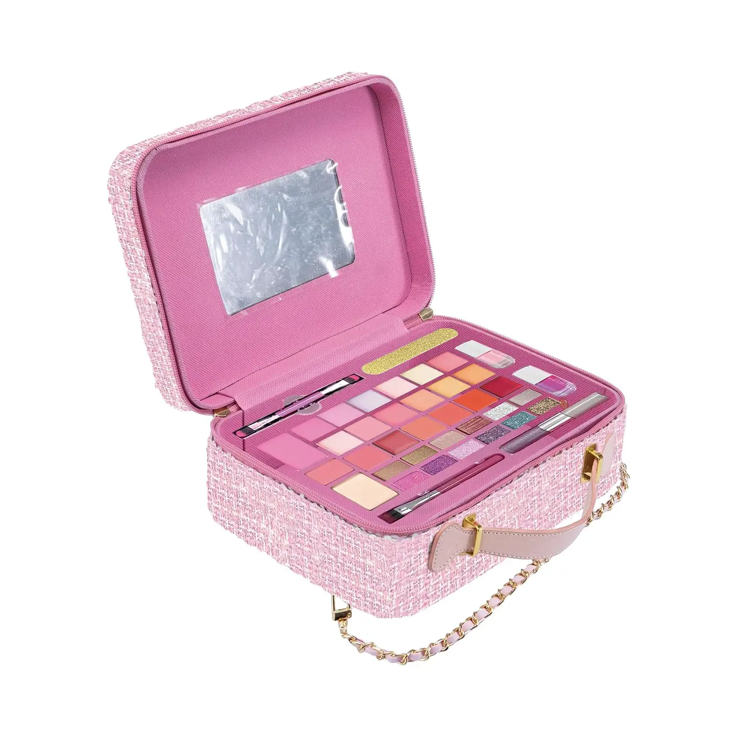 Caratteristiche: - Design Pratico e Versatile: Rifinita con paillettes reversibili e tessuto tweed bianco, è dotata di una comoda chiusura a zip e uno specchio interno. - Sicurezza Garantita: Il kit trucco è realizzato con materiali sicuri, senza parabeni e atossici, e i prodotti sono facilmente removibili con acqua e detergente delicato. - Dimensioni: L 26 cm x A 19,4 cm x P 9,3 cm