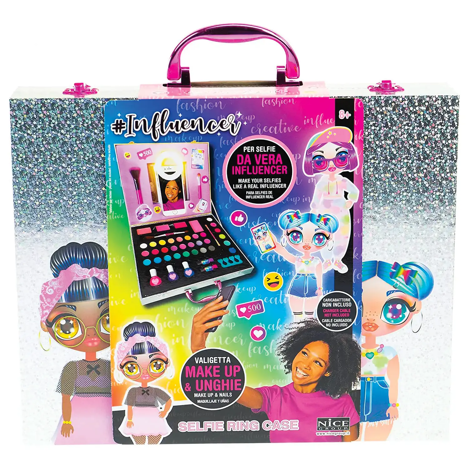 La Influencer Selfie Ring Case è una valigetta scintillante e olografica, decorata con immagini delle ragazze influencer, perfetta per le bambine che amano il make-up e i selfie. All’interno, troverai un assortimento di trucchi e un anello luminoso per scattare selfie perfetti.