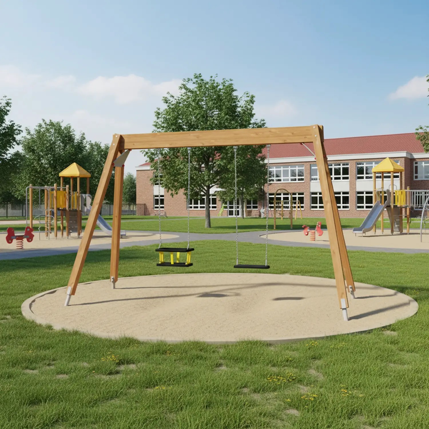 Altalena doppia per bambini dai 3 ai 12 anni, progettata per garantire sicurezza, comfort e divertimento all’aperto. Ideale per parchi giochi, giardini e scuole, con struttura robusta e materiali certificati.