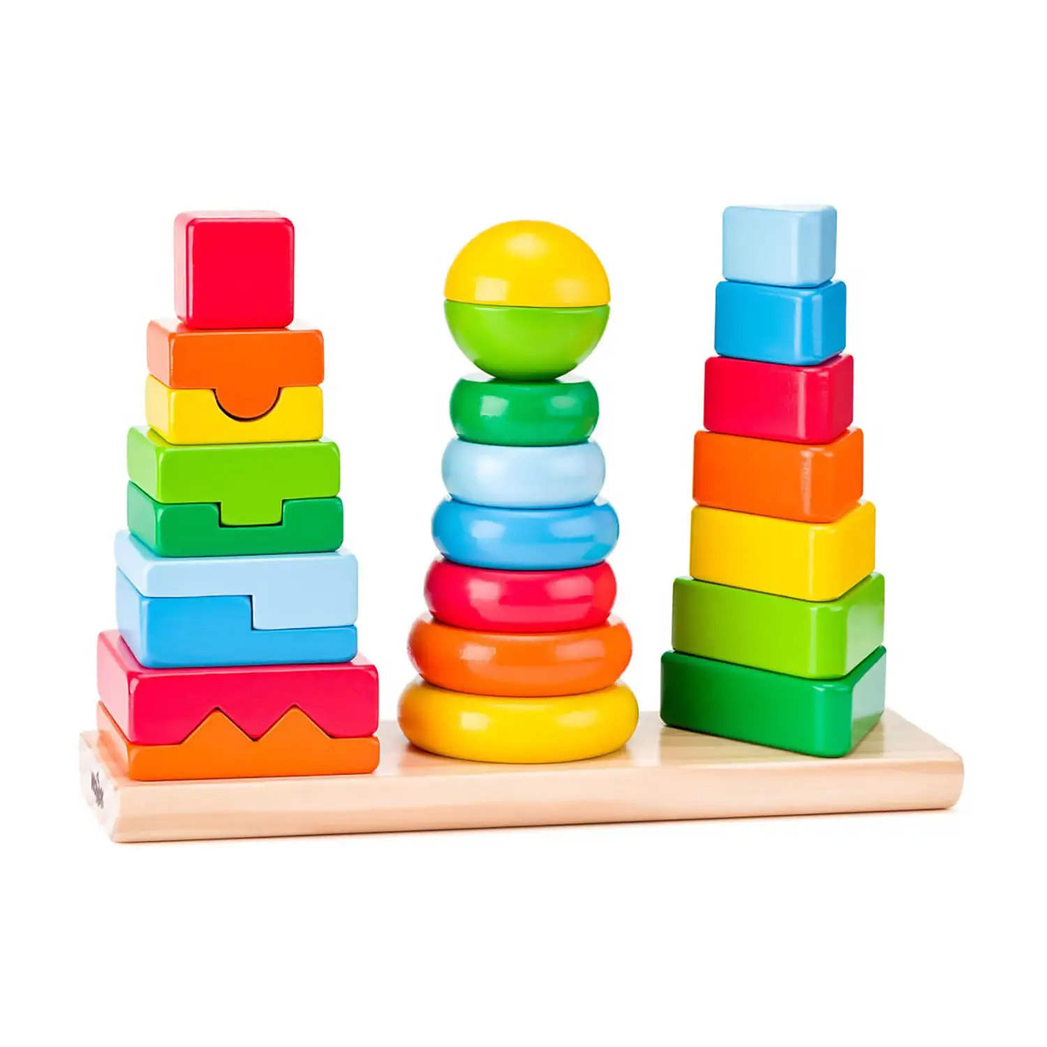 - ✅ Colorful wooden blocks to be strung and stacked on three rungs to create creative towers and combinations.