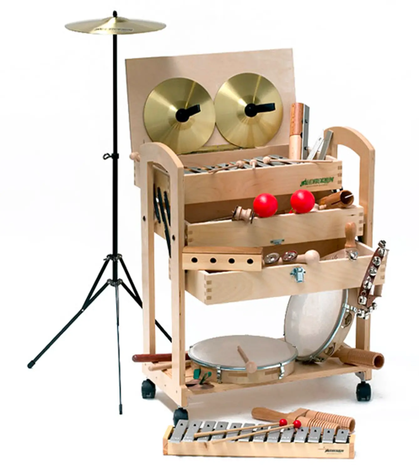 Il carrello contiene un ricco assortimento di strumenti ritmici e melodici, ideale per creare un’intera orchestra scolastica: