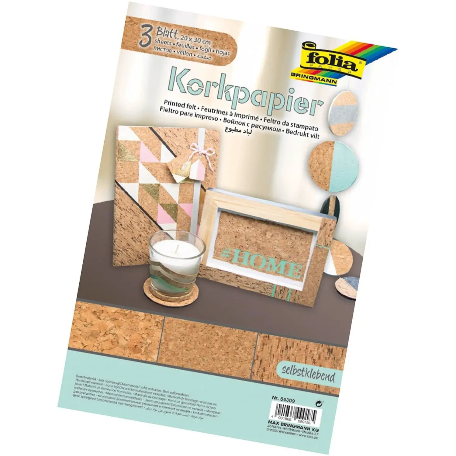 - ✅ Set di 3 fogli di carta-sughero autoadesiva, ciascuno con un motivo diverso, per progetti creativi.