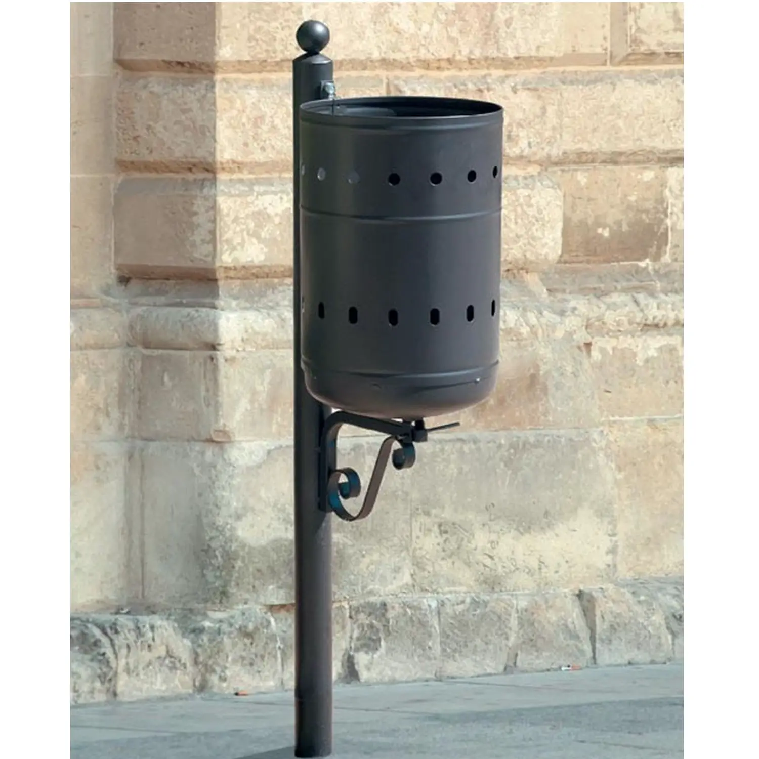 • Munito di paletto, da interrare, in tubo acciaio tondo diametro mm. 60x2, con sfera in ghisa nella parte superiore e sostegno sagomato reggi cestello • Cestello cilindrico a fondo bombato di diametro cm. 30x48h in lamiera acciaio zincata con doppia fila decorativa di fori tondi ed asolati