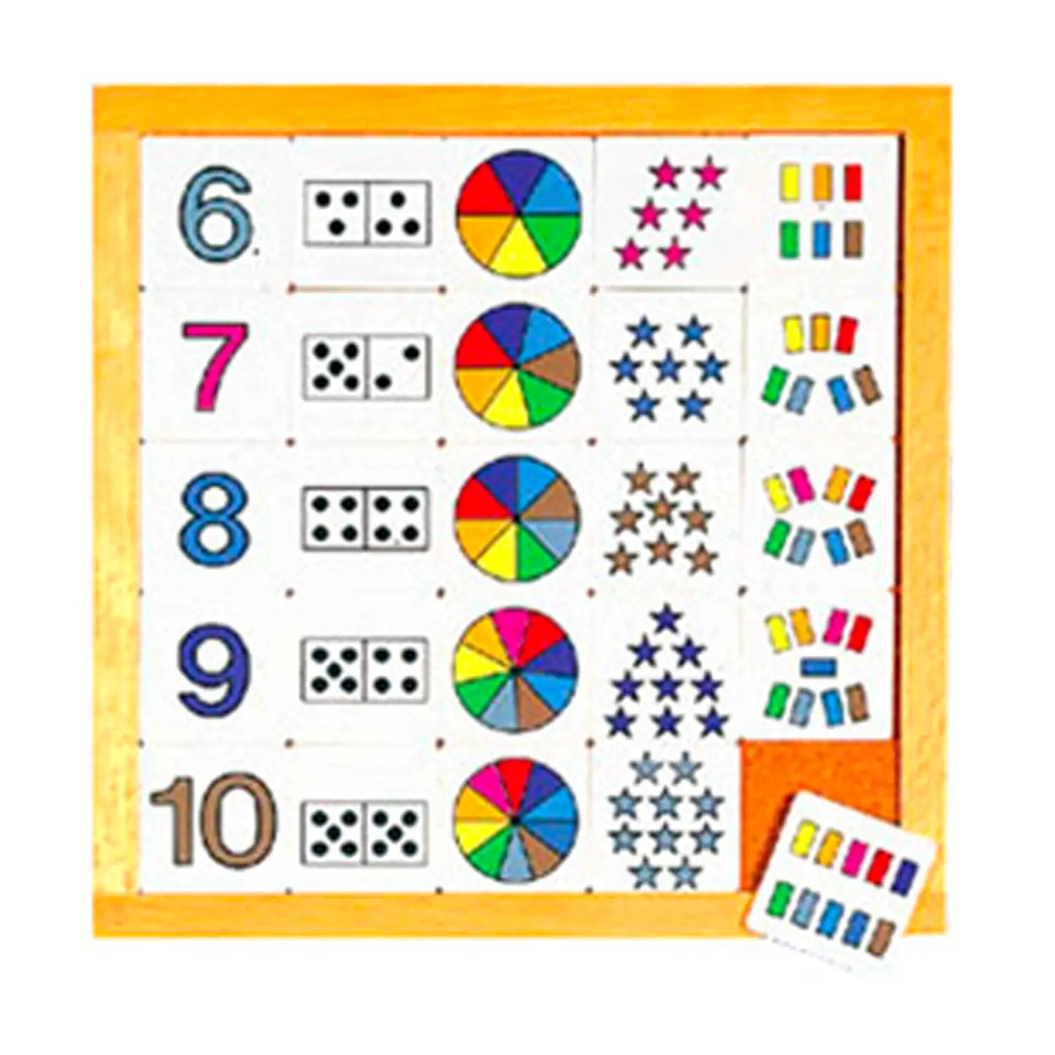 Gioco per la comprensione dei numeri dal 6 al 10 rappresentati in 4 simbologie con concetti di forma e colore. In una tavoletta di cm 34x34, si devono inserire le tessere in corrispondenza dell’esatta cifra.