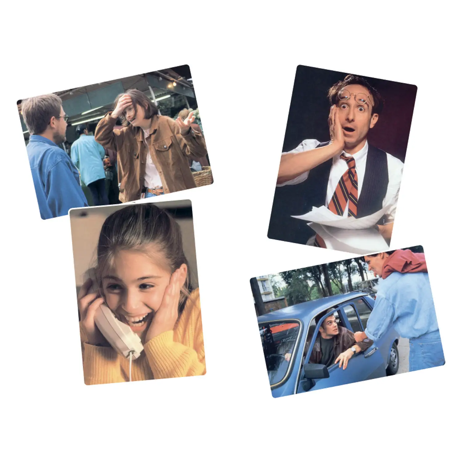 - 48 Flashcard a Colori: Ogni carta raffigura persone in diverse situazioni, mostrando chiaramente espressioni facciali e linguaggio del corpo.